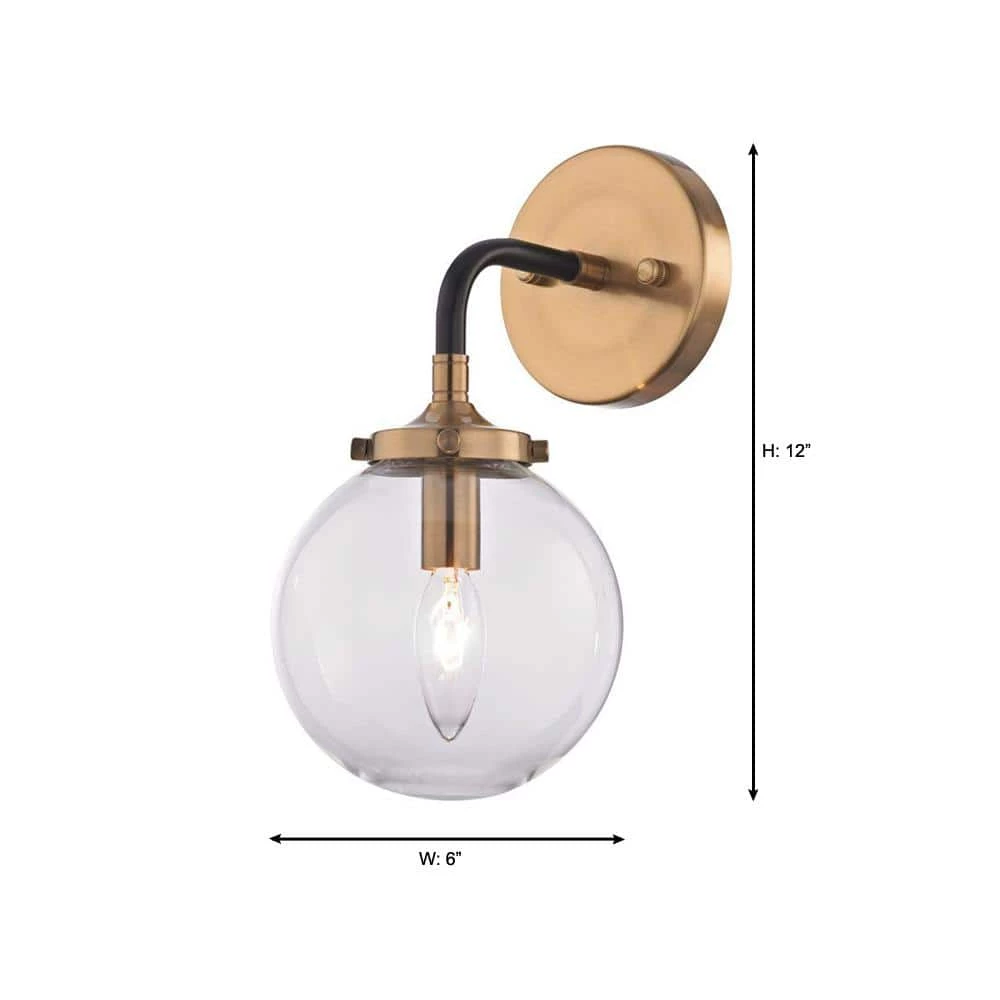 The Kendall collection showcases a retro design with a Matte Black-Antique Gold finished framework and clear glass globes that provide crisp light. This simple restoration style sconce is carefully constructed of metal and glass. Product intended for indoor use only.
