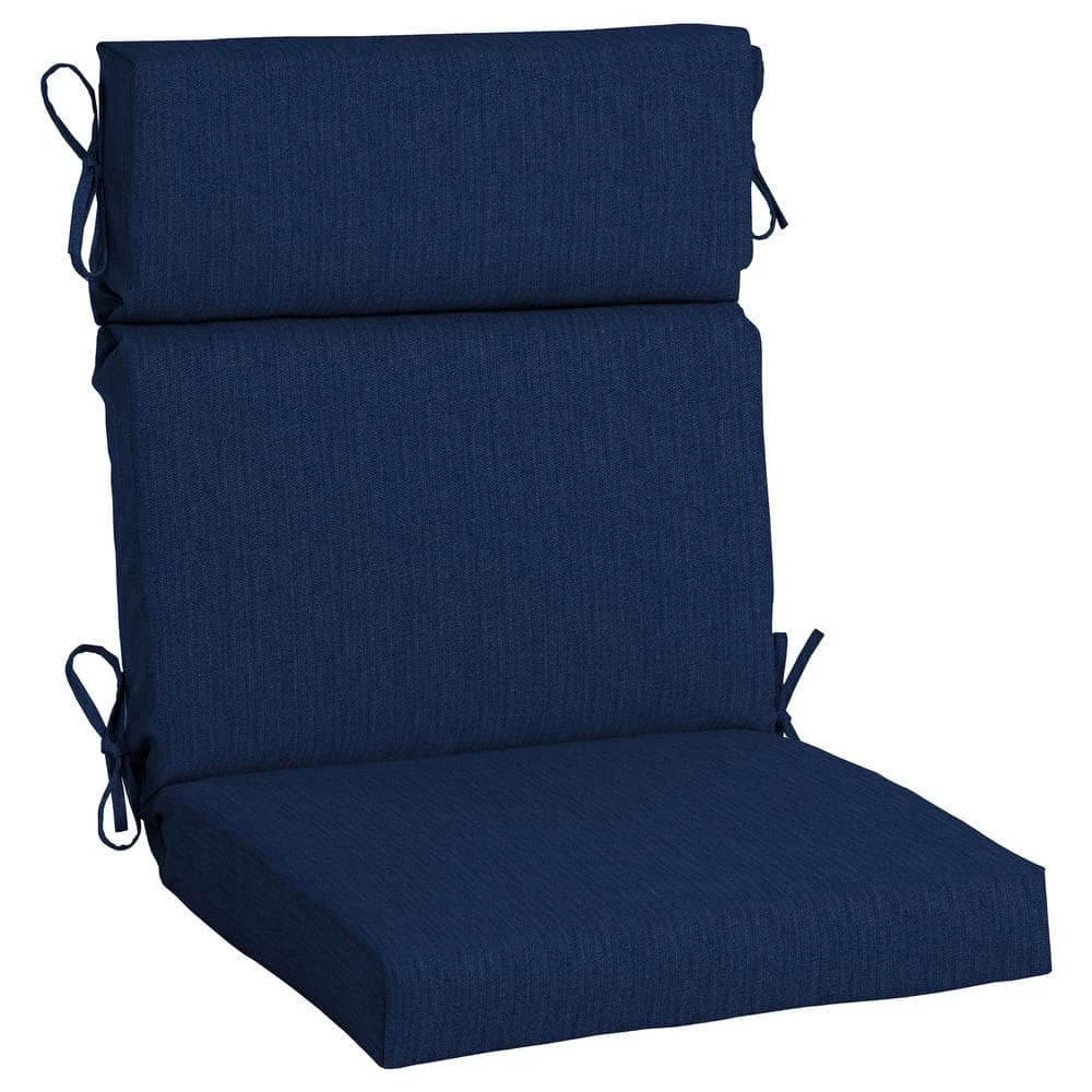 The deep blue of our Spectrum Indigo is reminiscent of still water and the sky at dusk. Rich and vibrant, the romantic nature of blue is a classic, referencing the age-old allure of the sea and its treasures as well as nighttime dreams. This hue is both familiar and undeniably elegant, a perfect combination for this Home Decorators Collection High Back Dining Chair Cushion. Our 44 x 21.5 in. outdoor dining chair cushion is covered in long-lasting and specially engineered Sunbrella acrylic fabric with built-in UV protection to help retain its vivid color and resist the elements all summer long. Inside our outdoor patio cushion we use our patented 100% everLuxe polyester fiber fill to help retain shape and provide long-lasting comfort during outdoor use. Fibers within the cushion are oriented in a vertical position, which provides structure, support, and spring. This outdoor dining chair cushion was engineered to fit the Oak Cliff and Niles Park furniture collections but is also suitable for most other dining chair frames with square seats. It comes with ties that ensure the cushion stays securely in place no matter the weather. Our outdoor dining chair cushion also comes with a 5-year limited fabric warranty and a 1-year limited warranty against defects in workmanship. Dine comfortably and in style on the Home Decorators Collection Spectrum Indigo High Back Dining Chair Cushion.