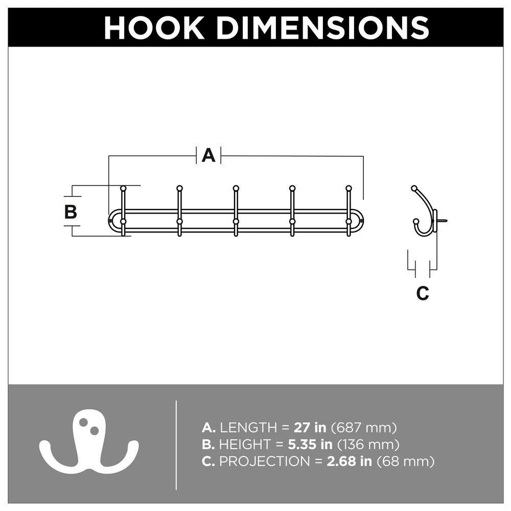 This 27 in. wire hook rack makes a great addition for your organization needs. The 5 hooks can hold your coats, hats, handbags, bookbags, robes and towels. This hook rack perfectly complements a casual modern home decor style.