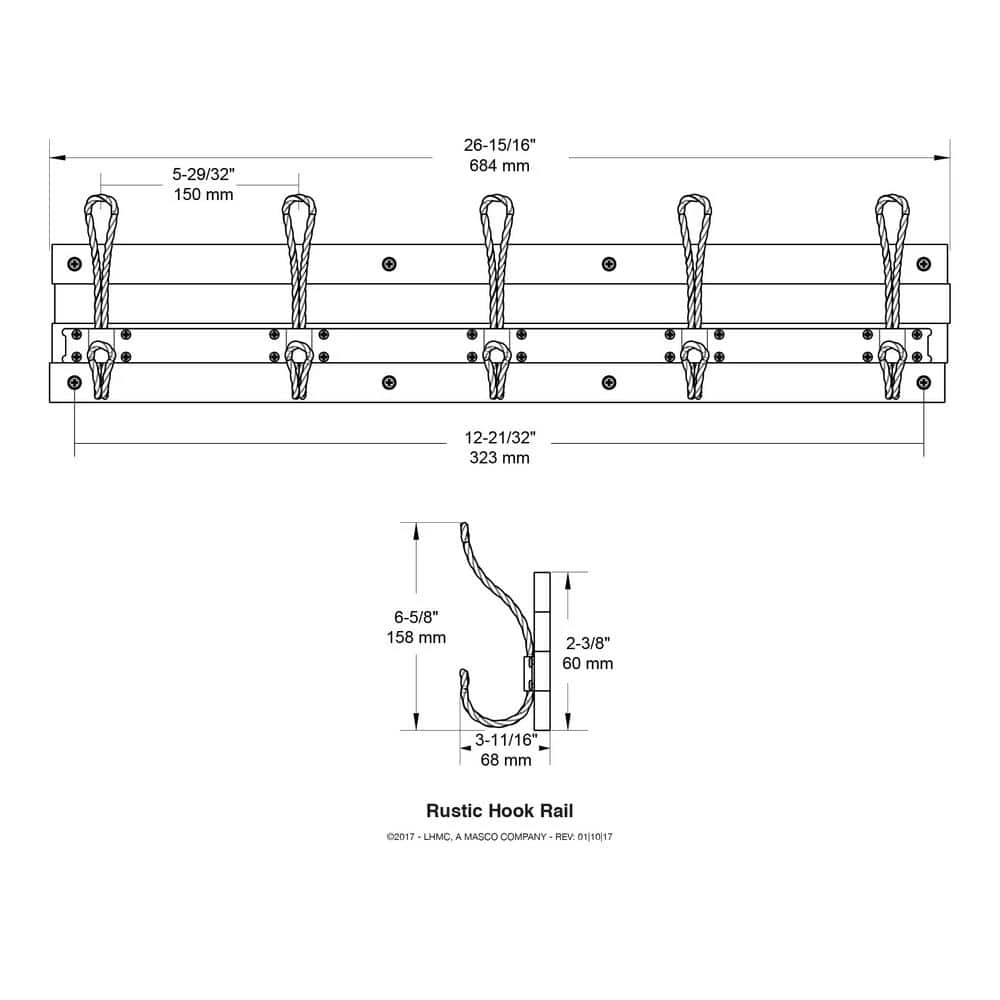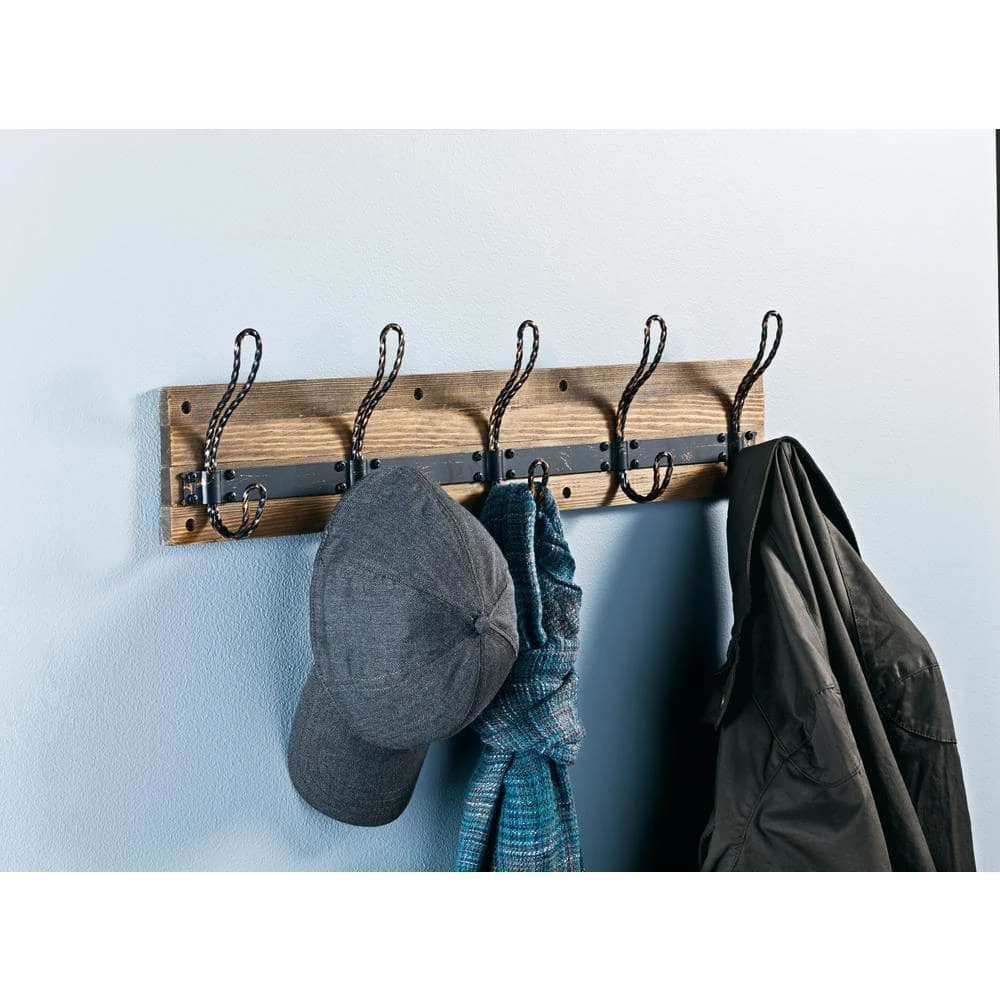 This 27 in. Rustic Pine and Distressed Brass Hook Rack makes a great homey addition for your organization needs. The 5 hooks can hold your coats, hats, handbags, bookbags, robes and towels. This hook rack perfectly complements a casual home decor style.