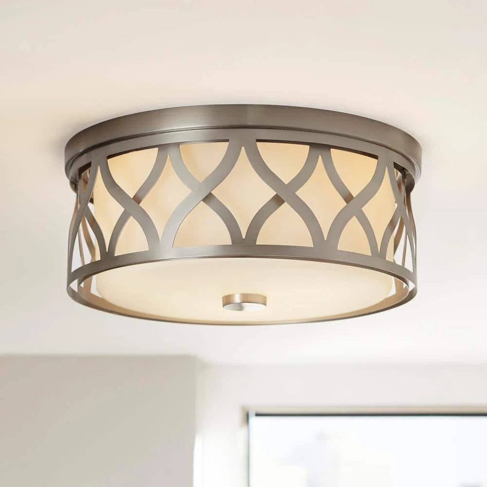 This 3-Light Flush mount features an interesting geometric pattern that has a graphic feel without overpowering the space. With It is Brushed Nickel finished frame and Etched White glass shade, the light gently diffuses with a touch of class. This flush mount is an elegant addition sure to add a little glitz to any room.