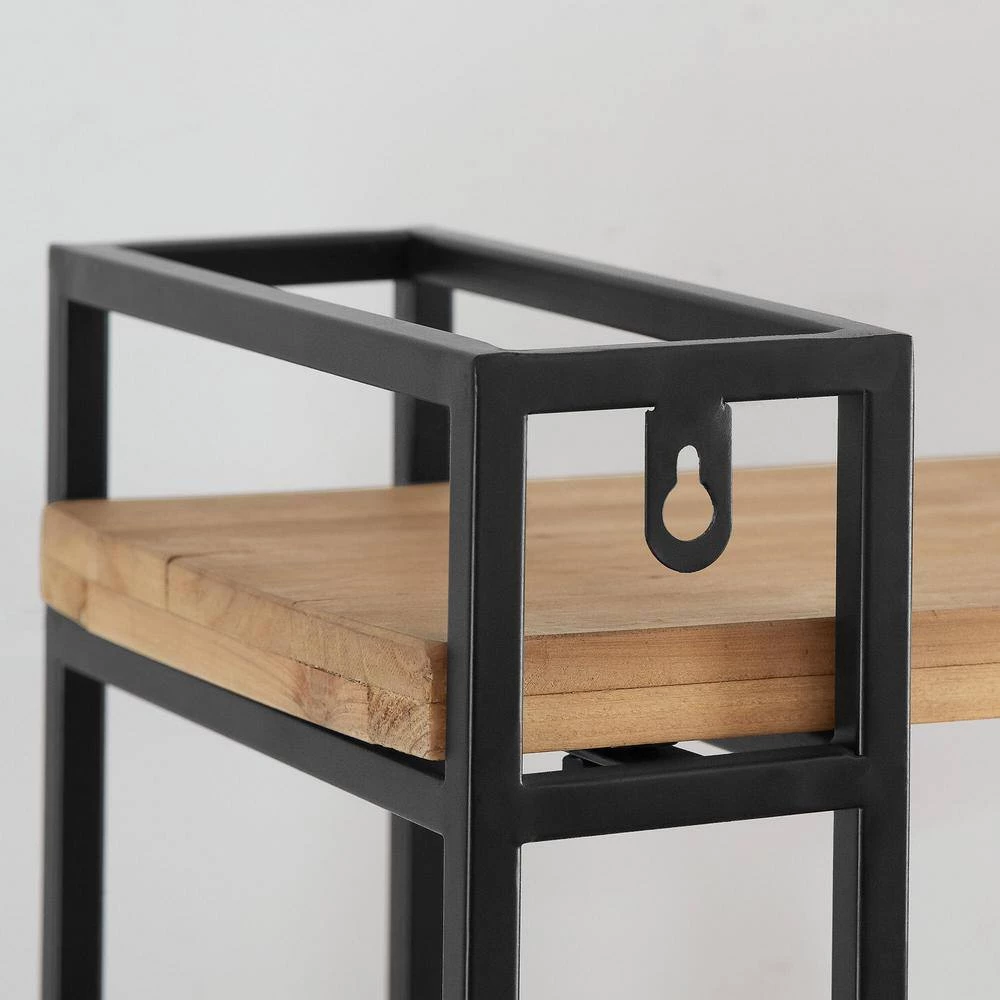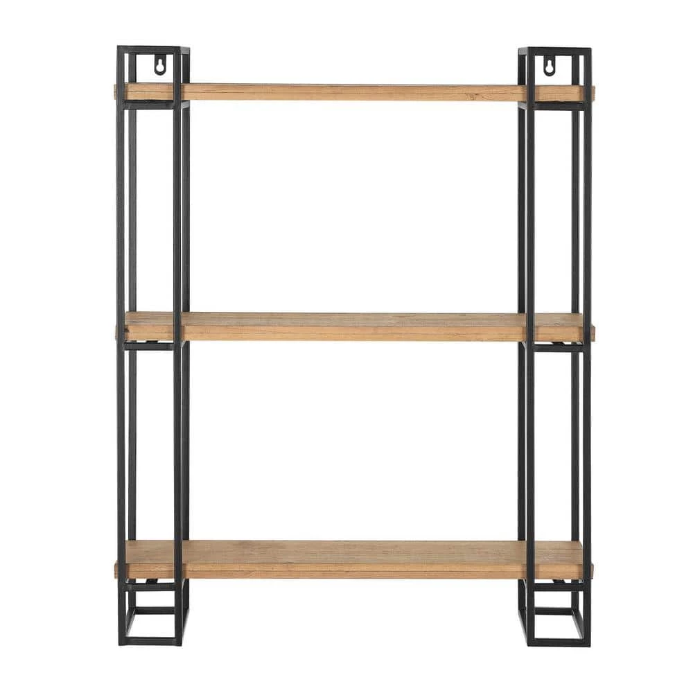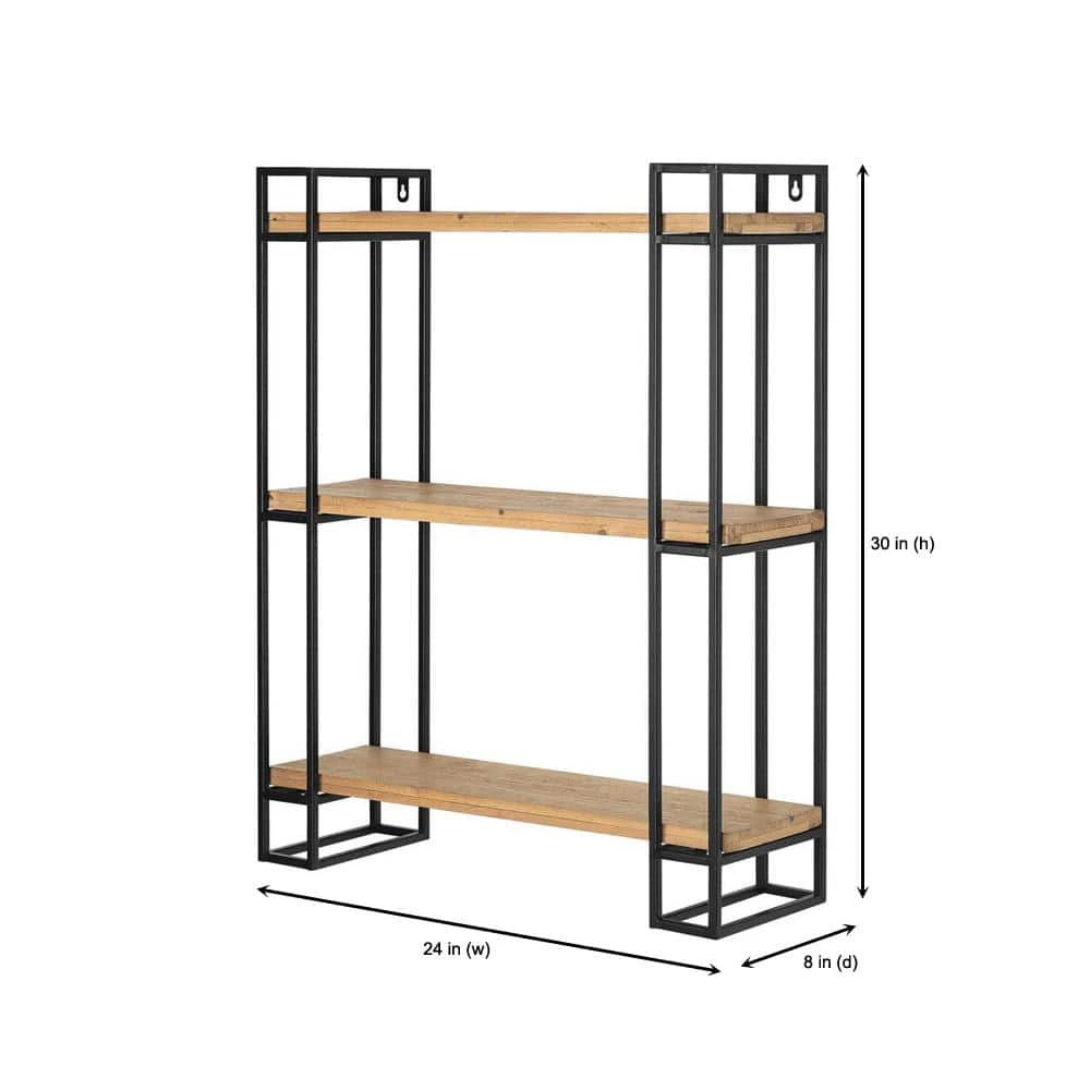 The Wood and Black Metal Wall-Mount Bookshelf from Home Decorators Collection features quality wood construction that ensures durability and allows for long-term use. Its 20 lbs. weight capacity allows you to conveniently organize and display potted plants, framed family photographs, and dinnerware. With its 3-tier design and the natural brown wood finish, this shelving unit adds a vintage touch to your farmhouse-style decor.