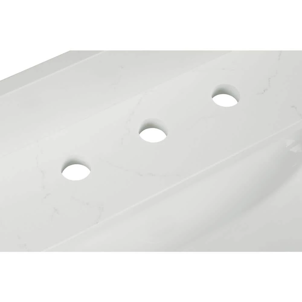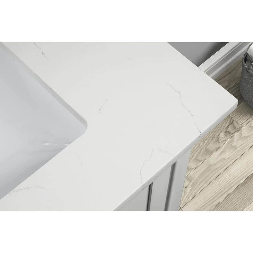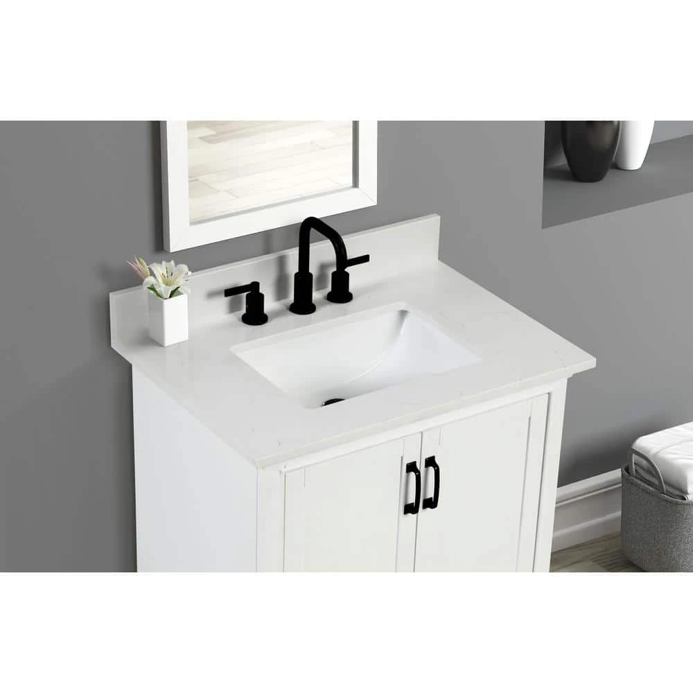 31 in. Carrara White Quartz Top. Attached stylish rectangular white vitreous china undermount bowl with safety overflow hole. 4 in. high backsplash included to help protect walls from water damage.