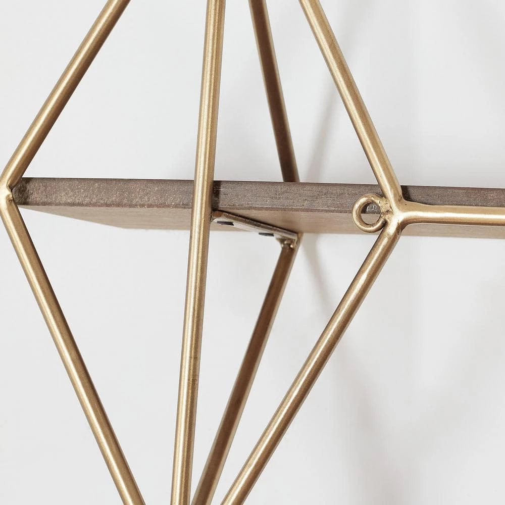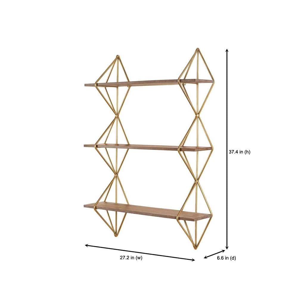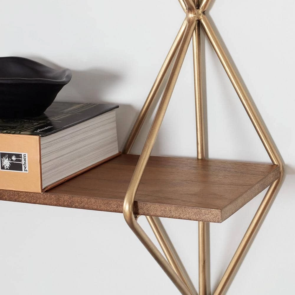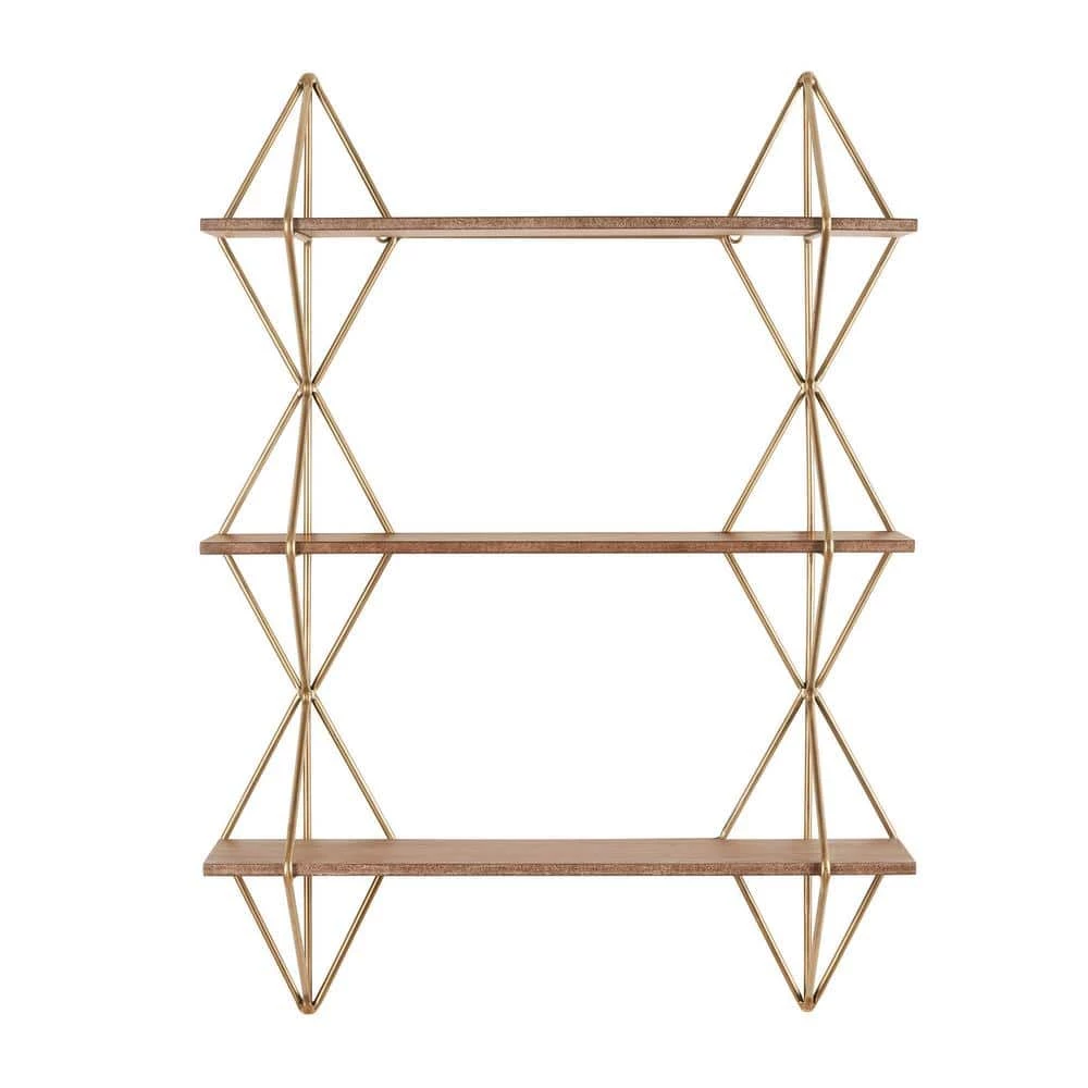 The Home Decorators Collection Wood and Gold Metal Wall-Mount Bookshelf perfectly displays your photos, books and more. It features a unique design with three shelves, gold metal framework and wooden shelves. This shelf is perfect for your living room, kitchen, bedroom and more, plus it’s simple to hang with ring hooks on the back.