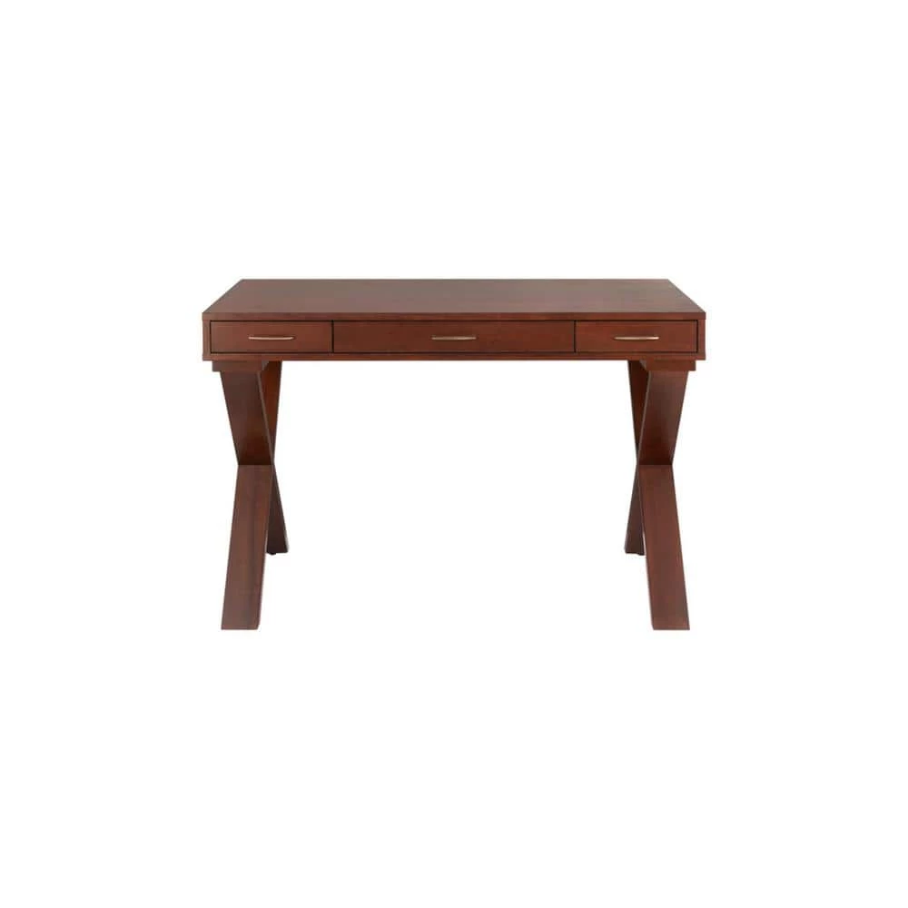 Our Home Decorators Collection Saratoga writing desk is the perfect place to pen notes or type emails. Its campaign-style design brings sleek, modern appeal to your decor. Three drawers hold notepads, pens and more. At almost 4 feet wide, the rectangular desk has room for a laptop, printer and decorative accents.