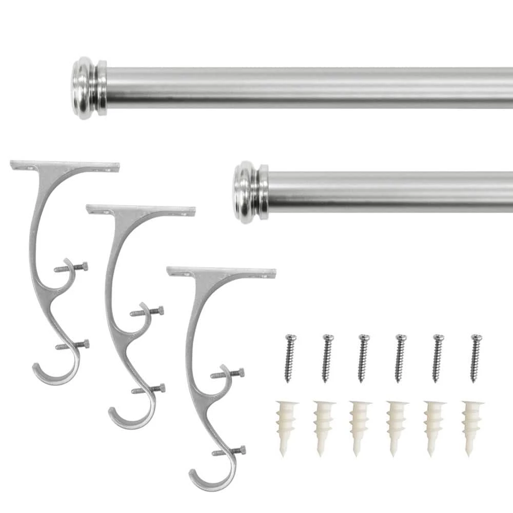 This all-inclusive Brushed Nickel Double Drapery Rod Kit beautifully adorns your stylish window treatments. Featuring a versatile finish that complements a variety of decor styles. This kit includes a 50 in. – 144 in. telescoping pole, two 3/4 in. endcaps, brackets and mounting hardware for a quick and easy installation.