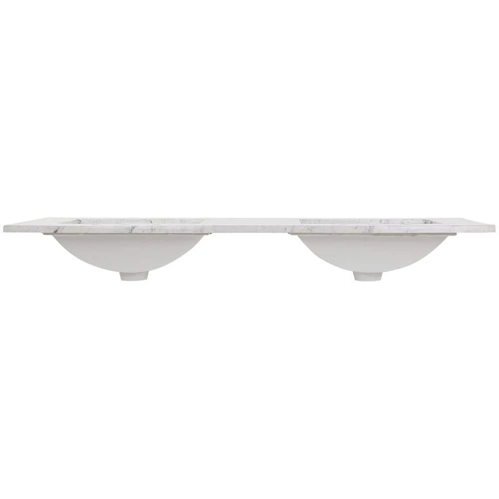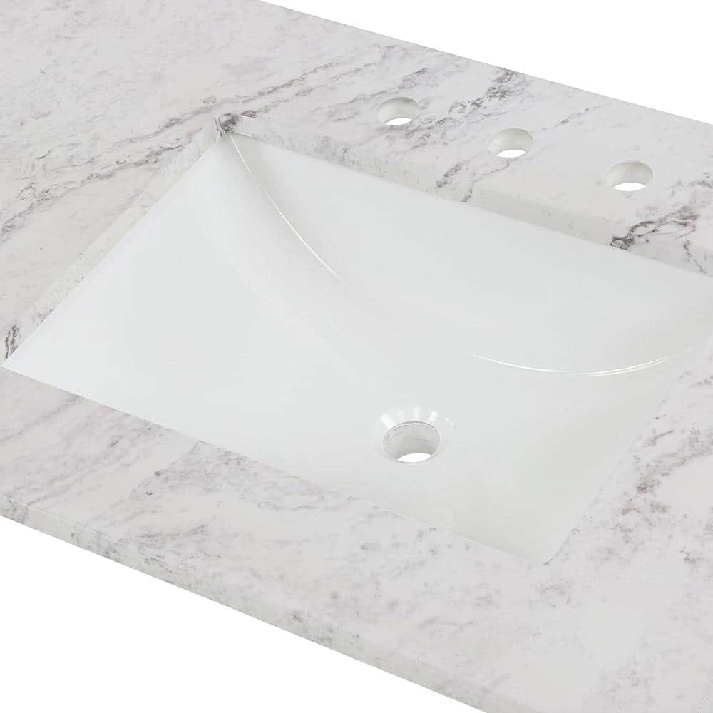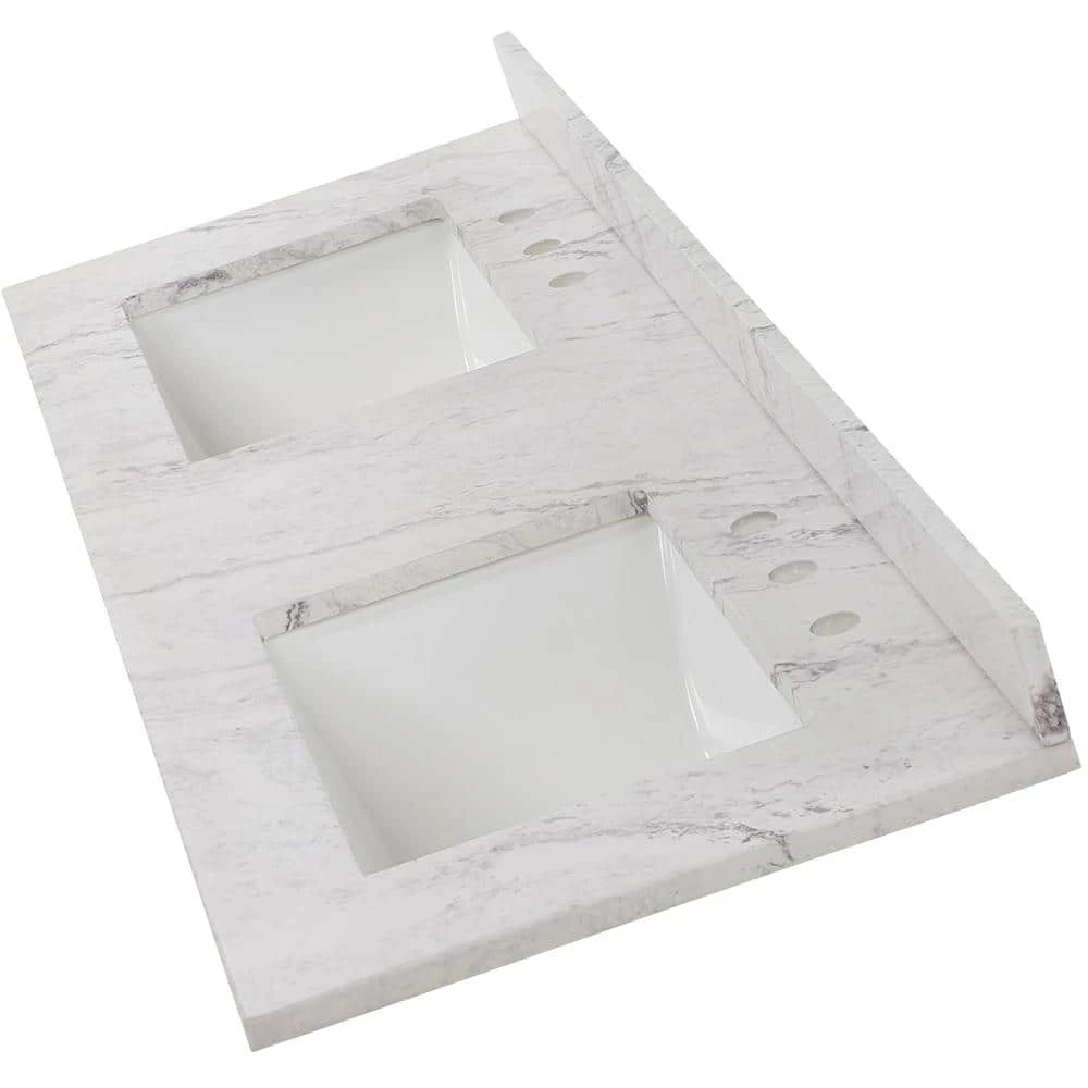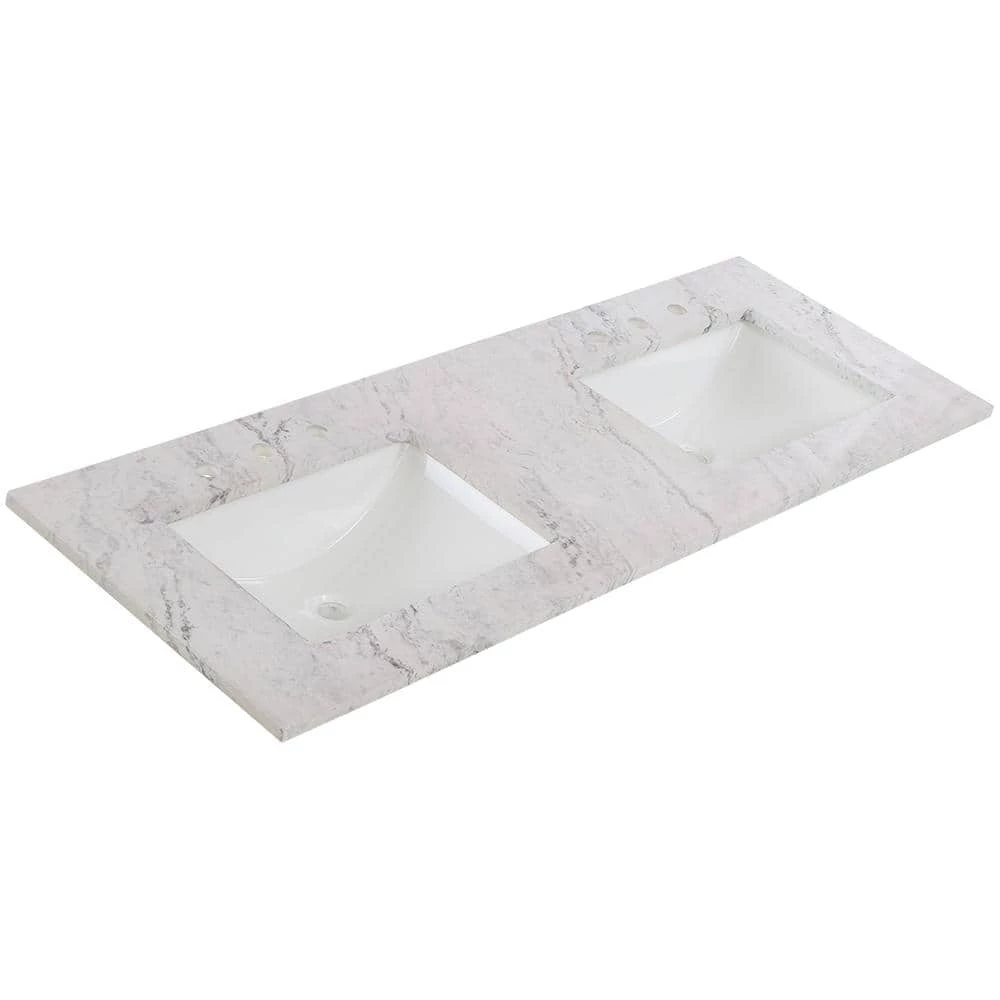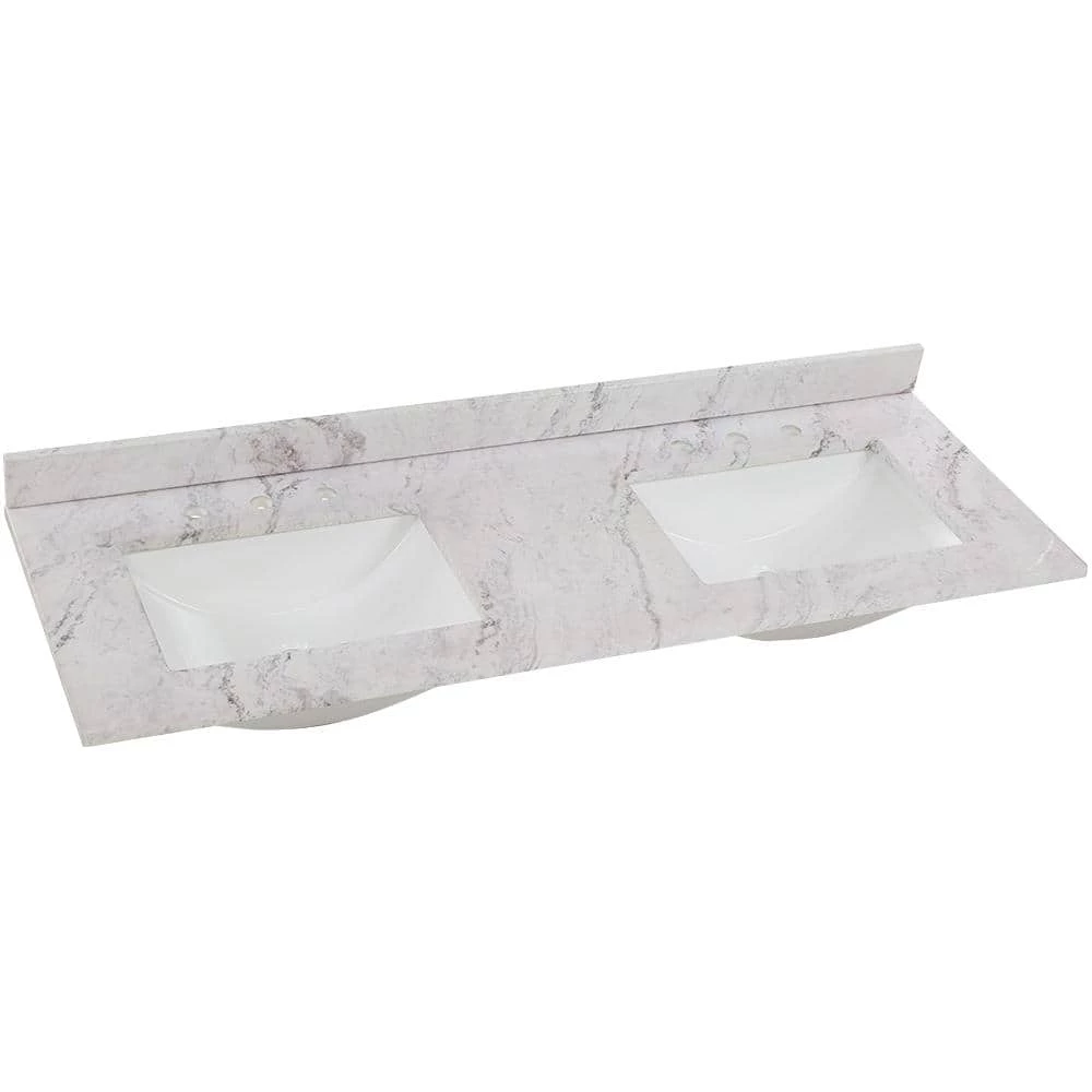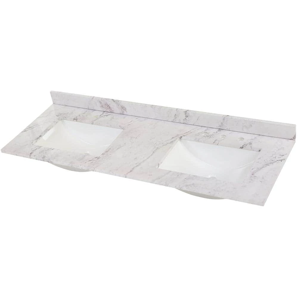 The Home Decorators Collection 61 in. W Stone Effects Vanity Top in Lunar effortlessly unites fashion and beauty with quality material. The Lunar vanity top finish comes with a matching 3.5 in. tall separate backsplash to help protect your walls from splashes and stains and features a white base with soft and striking veining of light gray and black. Durably built with 2 factory assembled white rectangular undermount sinks, the Home Decorators Collection vanity top is elegant, easy to clean, and ready to be installed atop the cabinet of your choice.