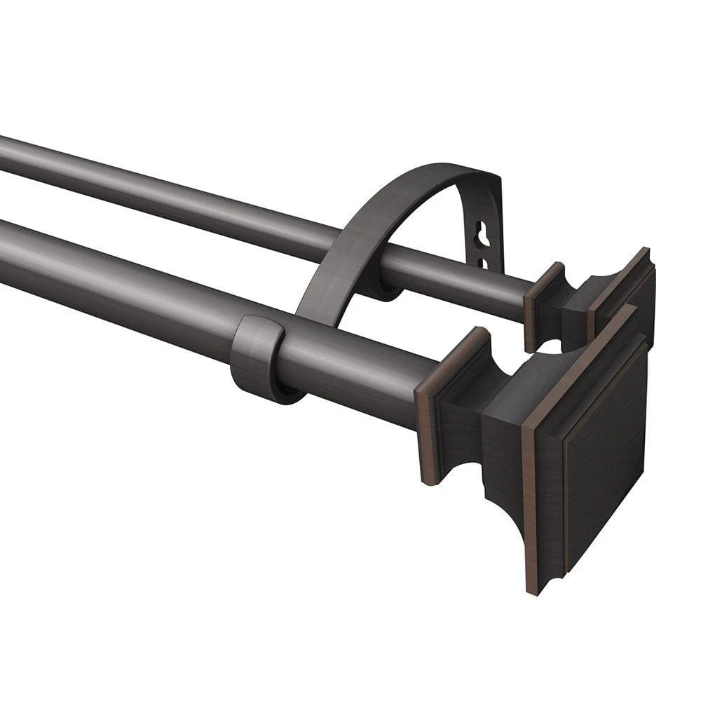 The Double Curtain Rod Series from the Home Decorators Collection lets you create a gorgeous layered style with a sheer curtain on the inside layer to filter natural light and heavier panels on the outside layer to block light and provide privacy. Adjustable from 72 in. L – 144 in. L, the rods are made of metal for durability. With elegant oil rubbed bronze finish, the Square finials work well with classic decor. Every double curtain rod kit comes with 2 telescoping rods, 4 finials, installation brackets, and mounting hardware so all you need for a quick and easy installation is a screwdriver or a cordless drill.