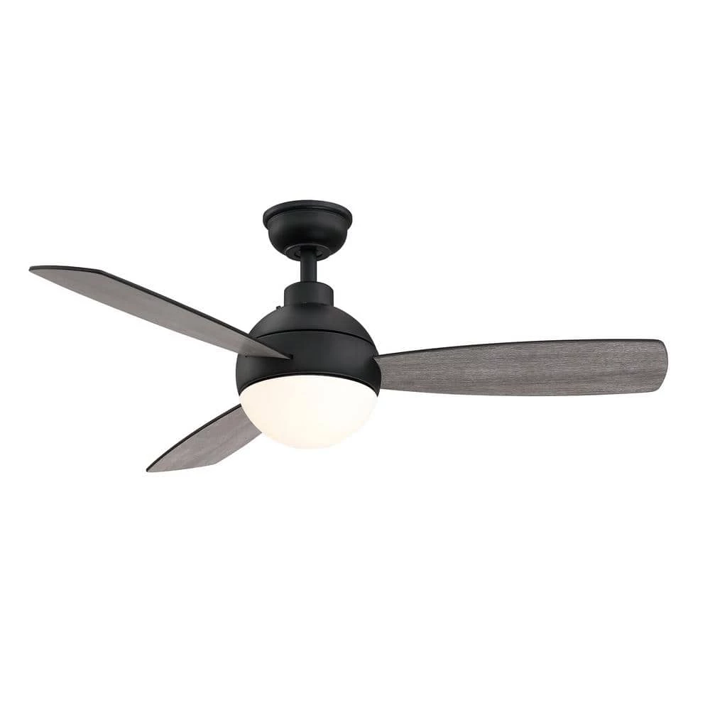 Enhance your home interior with this Home Decorators Collection Alisio 44 in. LED indoor ceiling fan. Designed for 10 ft. x 10 ft. rooms, it offers an integrated Samsung LED light source. For convenience, it includes a handheld remote. Frosted opal glass, a matte black finish and three reversible blades create a charming look.