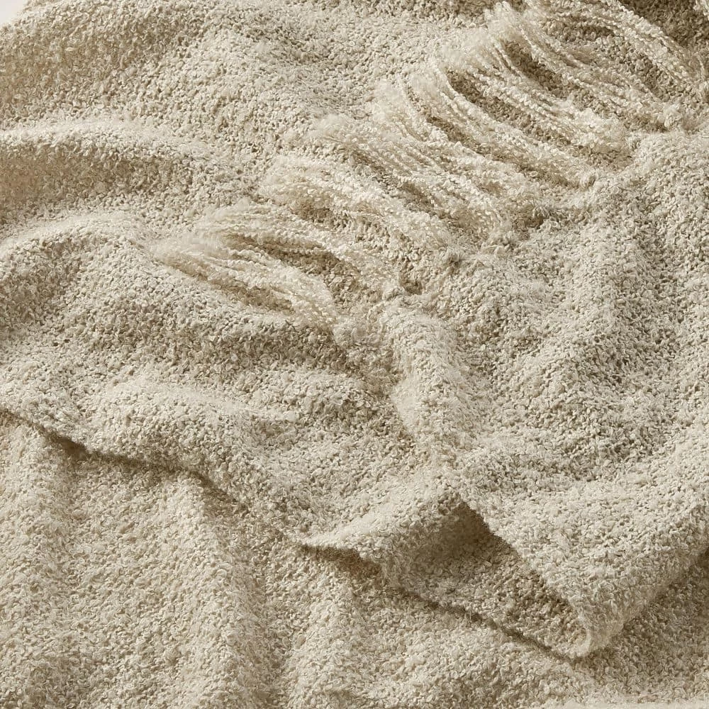 - Soft textured, ivory boucle throw blanket with tassels to keep you cozy all season long