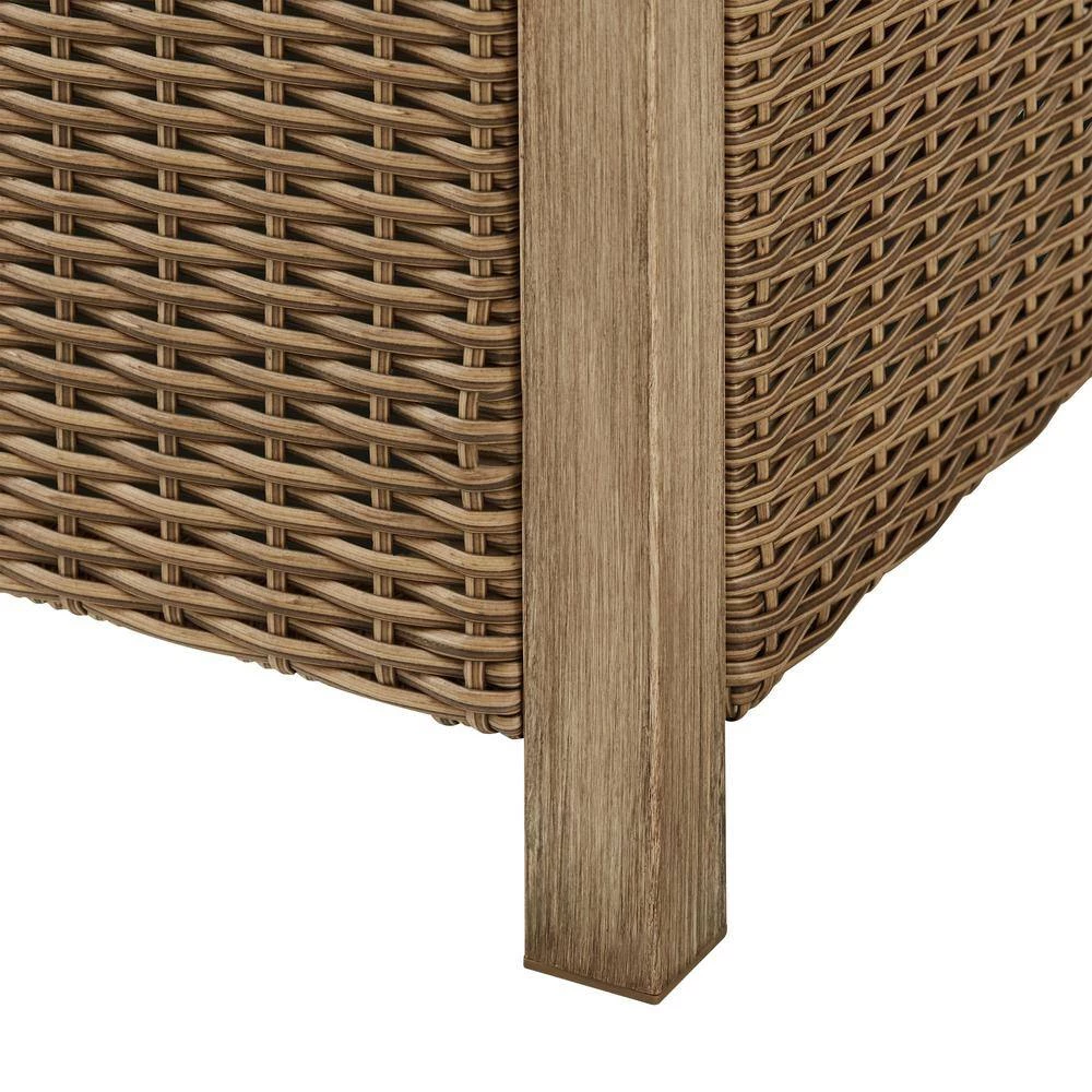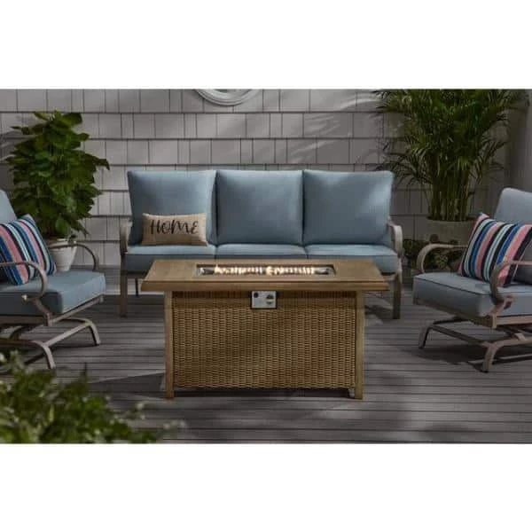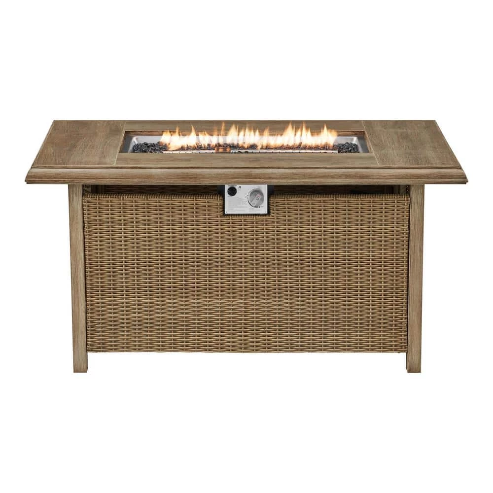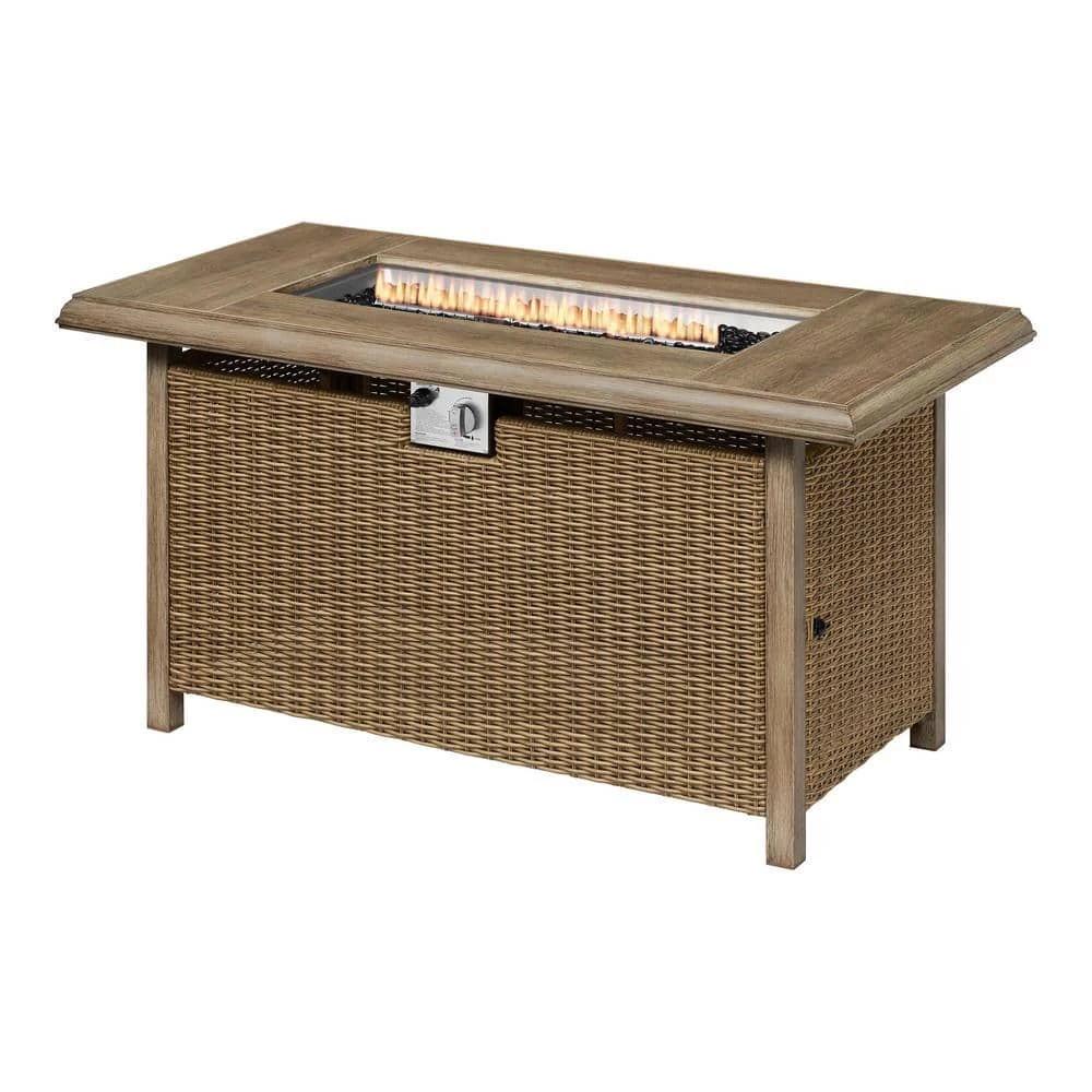Featuring durable aluminum and tile construction and hand-crafted wicker sides, this Anaheim fire pit table creates a comfortable and stylish gathering space for outdoor entertainment. It is heat, scratch, weather, and rust-resistant so you can enjoy many seasons of worry-free lounging. With 7-10 inches of mantel around the fire bowl, this 49 in. x 25 in. gas fire pit offers plenty of tabletop space for dining and entertaining while gathered around the warm flames. Pairs well with light color metal, wicker, or wood patio furniture.