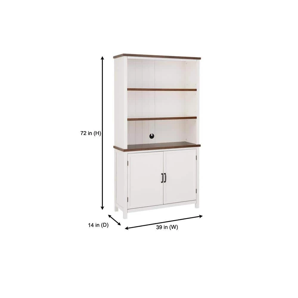 Our Home Decorators Collection Appleton bookcase is a handsomely designed display piece and file cabinet when you want to keep sensitive documents under wraps. The two-tone home office bookcase has a beadboard, farmhouse-style backdrop framing the open shelves, plus a cutout for streamlined cord access to a nearby wall outlet. Two file drawers are contained within the double doors.