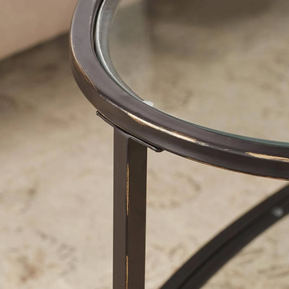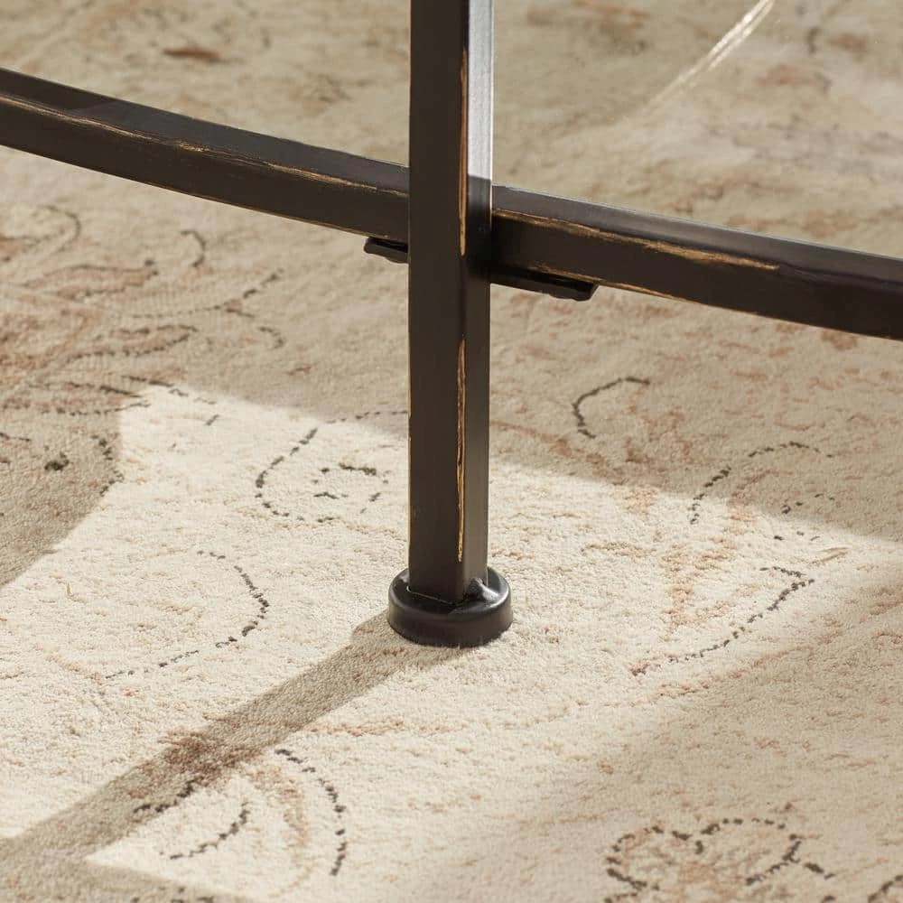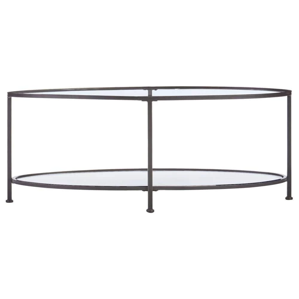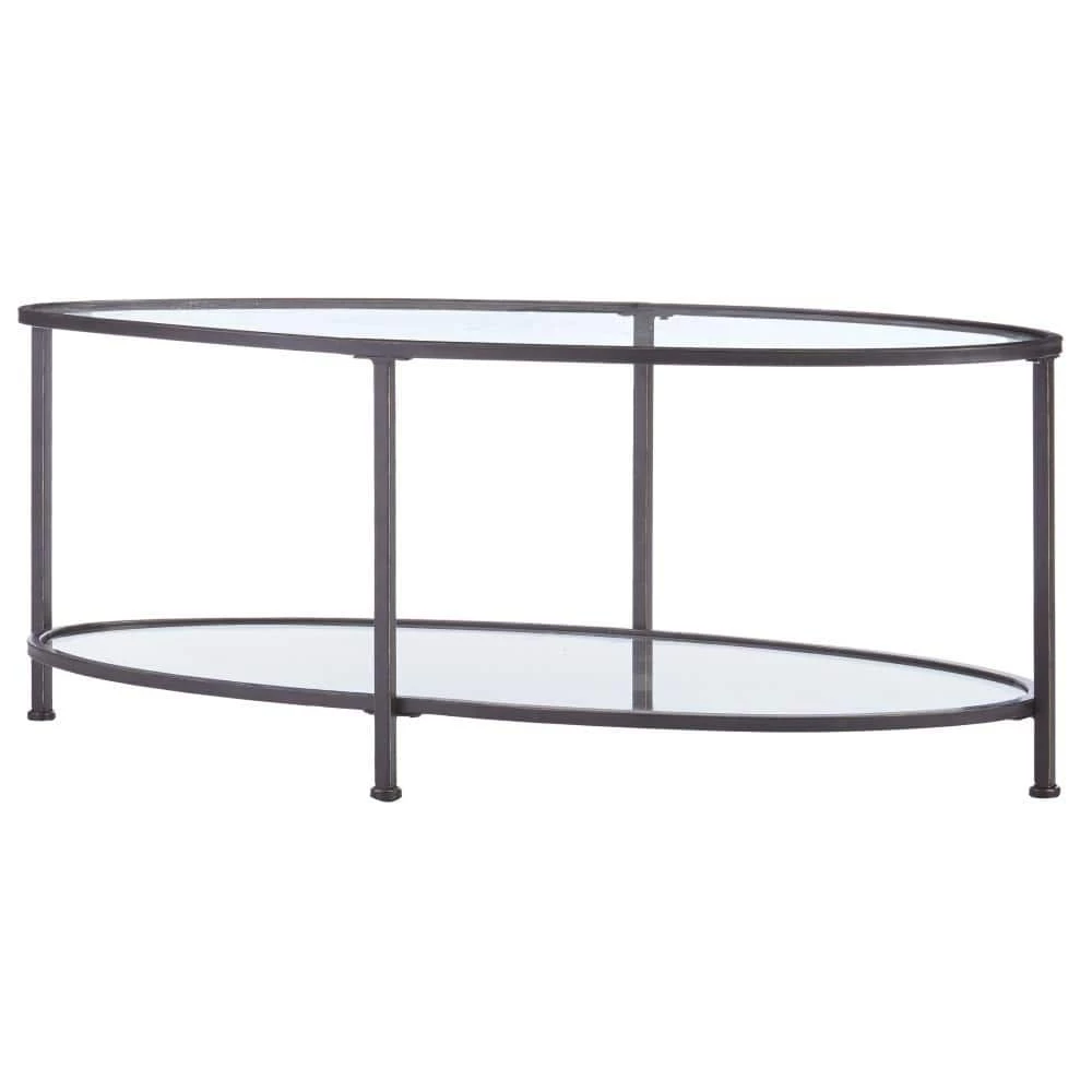 Our Home Decorators Collection Bella oval coffee table is poised to steal the show in a living room or family room. Tempered glass forms the tabletop and lower shelf. An antique bronze finish warms the coffee table’s sleek oval metal frame.