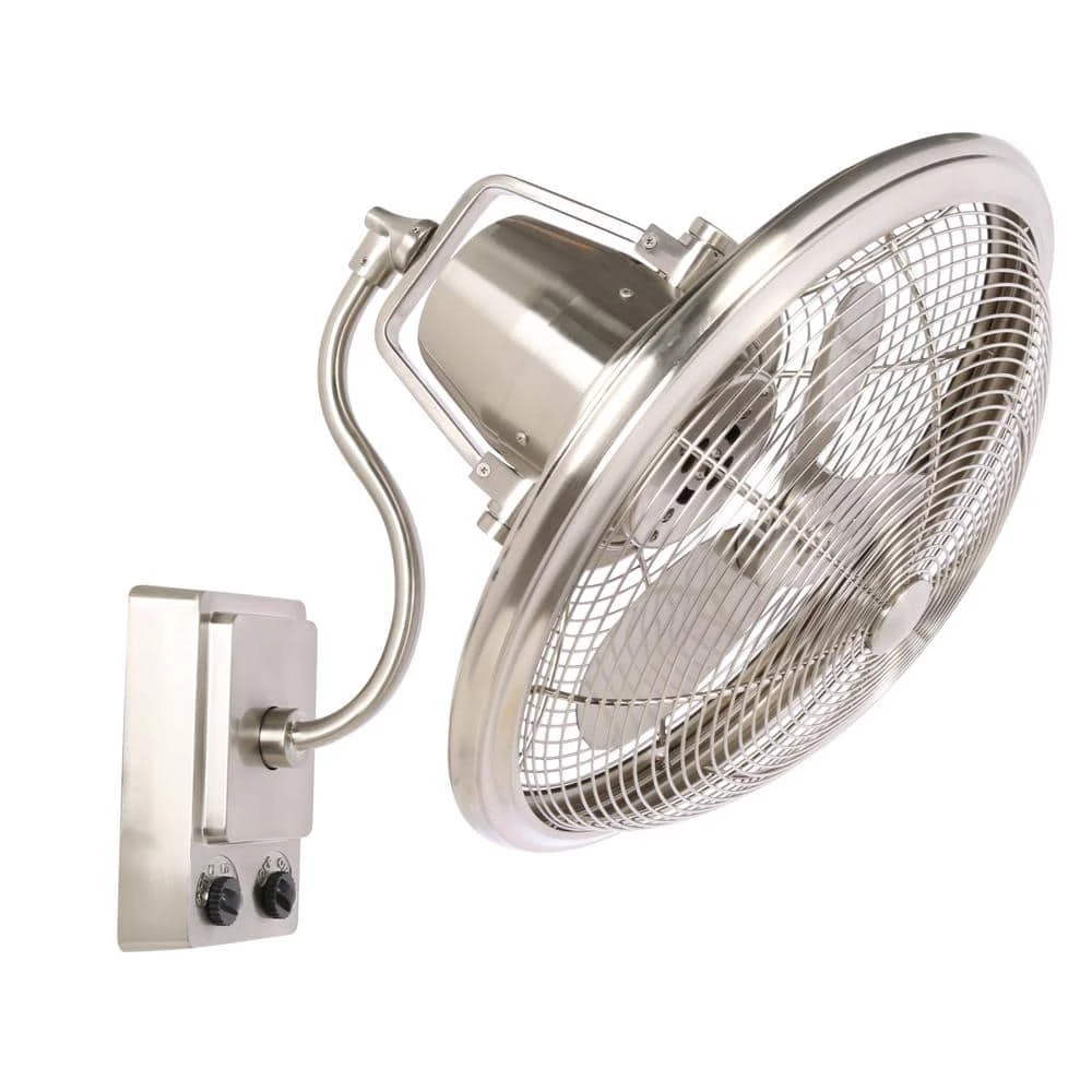 The Home Decorators Collection Bentley II 18 in. Brushed Nickel oscillating wall fan is perfect when you require air circulation in specific areas. Install this fan onto any wall, and it includes a 9 ft. plug in cord for power and 18 in. decorative cage design. It has separate controls that operate the fan speed and oscillation. It is suitable for indoors or outdoors if used under a covered ceiling. This wall fan is part of a Bentley II collection that also has a matching oscillating ceiling fan.