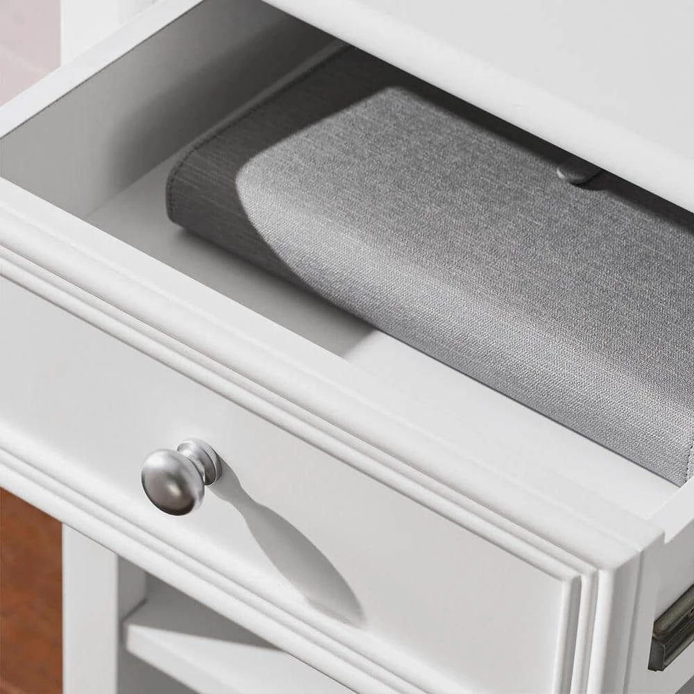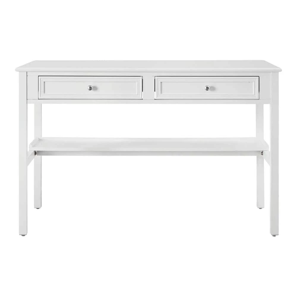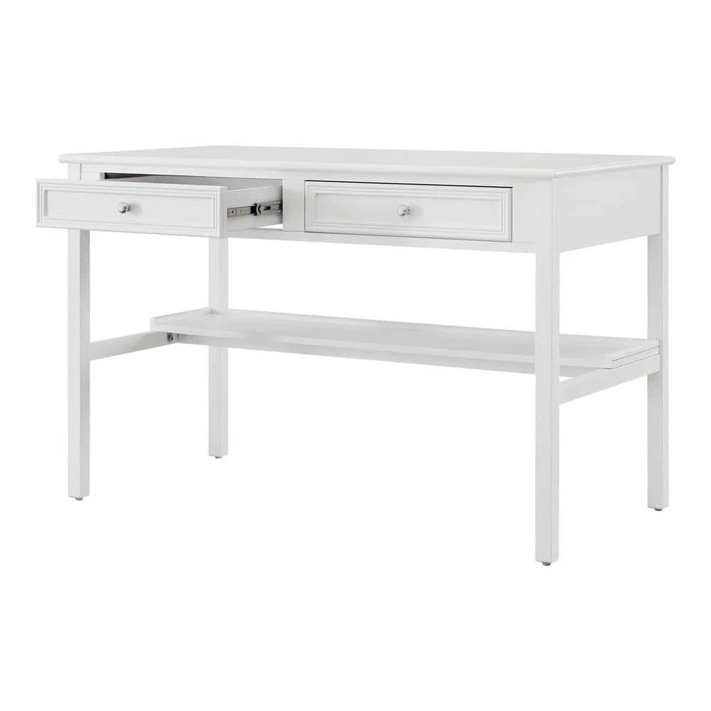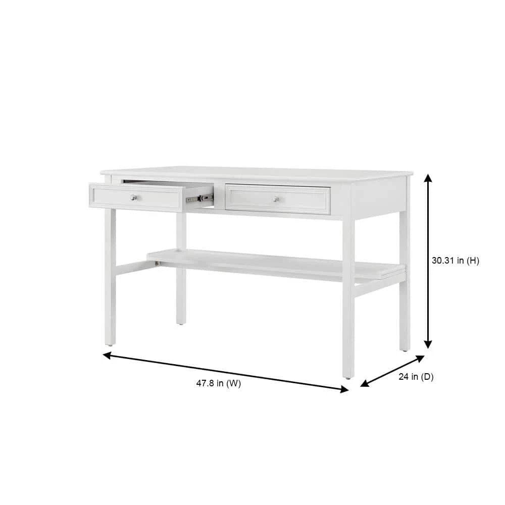 The Bradstone White Desk is the epitome of sophisticated transitional style, with a simple elegance that complements a variety of decors. It boasts two pullout drawers to store supplies, keeping your workspace tidy and a large desktop. Perfect for your home office, or cozy study space, this desk features a white finish and brushed nickel hardware to complete the look.