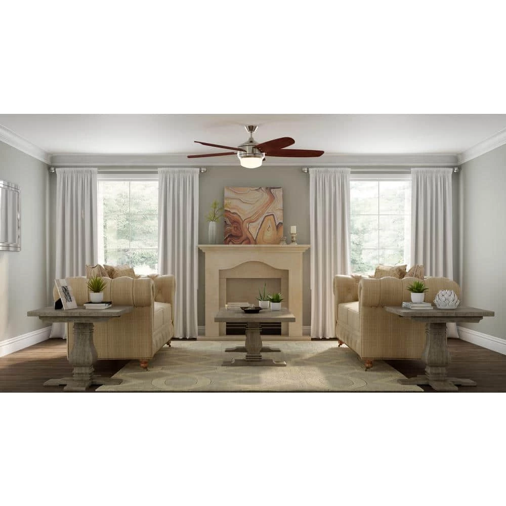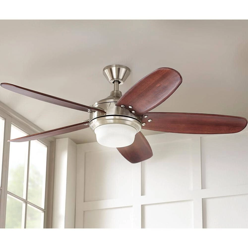 The Home Decorators Collection 56 in. Breezemore marries form and function in this beautifully designed ceiling fan. The hand-carved wood blades install easily in a flywheel design and the frosted bowl of the light kit simply twists into place to make installation a breeze. Included with this fan is a feature-rich remote control that controls the fan speed and lights as well as airflow direction. The remote also has a comfort breeze setting which will automatically vary the fan’s speeds at different intervals to create an organic breeze effect. Another convenient feature of the remote control is the timer function which allows the light and/or fan to be turned off at a predetermined setting. DC motor fans are 70% more energy efficient than AC motor fans (when comparing efficiency (CFM/W) of DC vs AC motors in published FTC Energy Guides for ceiling fans).