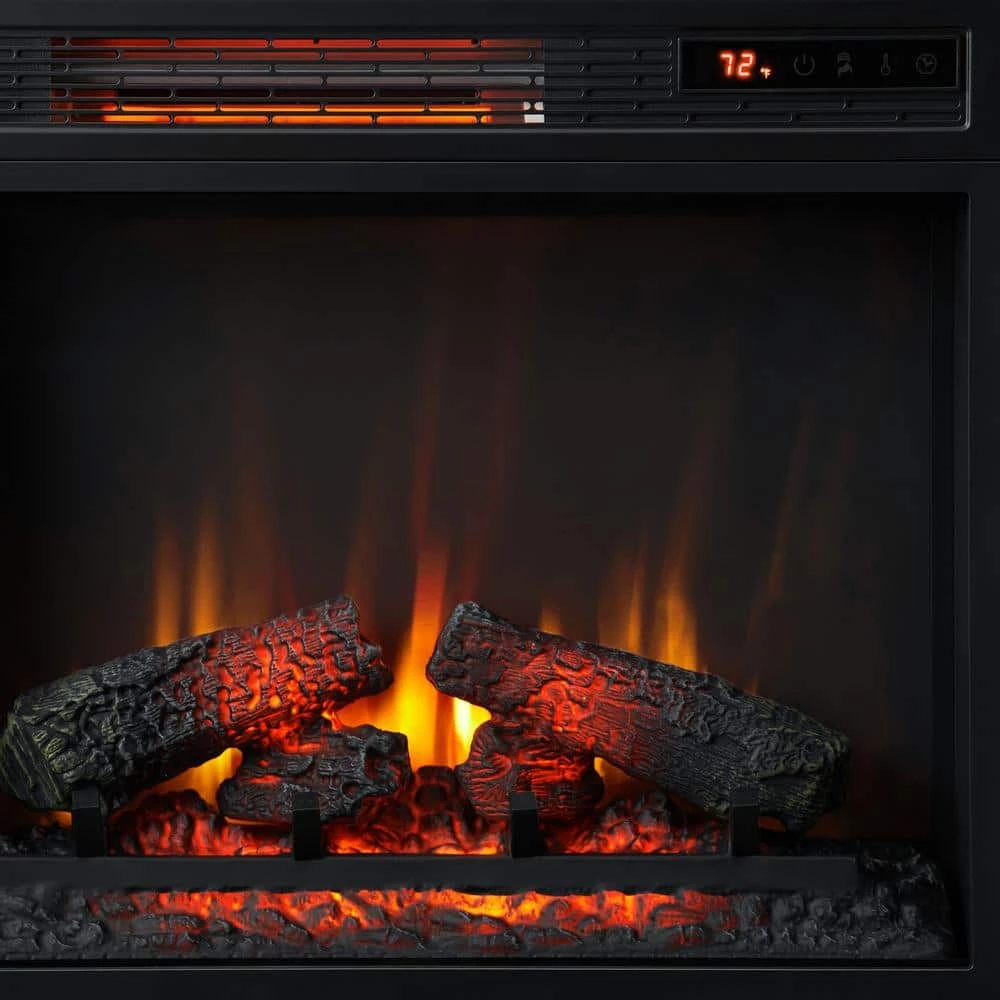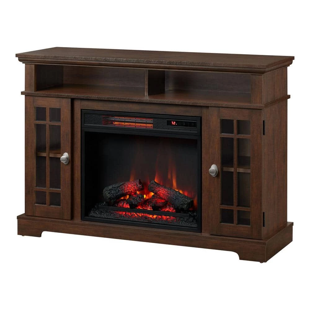 Warmth, ambiance, and style come together in this TV stand with infrared quartz electric fireplace. The supplemental zone heating efficiently heats up to 1,000 sq. ft. of your home so that you can lower electric bills and save money. The infrared quartz technology works to maintain natural humidity for a superior warmth that won’t dry out the air. Enjoy the ambiance of your fireplace with or without the heat while the brilliant flames stay on. The Spectrafire flame effect technology offers 3 blue and 3 amber effect options on the realistic log set and ember bed to create your ideal fire experience. The settings are easily controlled using either the control panel on the unit or with the remote control included. Use the center media shelf and side cabinets to store media components and TV accessories while adjustable interior shelves provide customizable storage. This TV stand can hold most flat screen TVs up to 55 in. or up to 55 lbs.