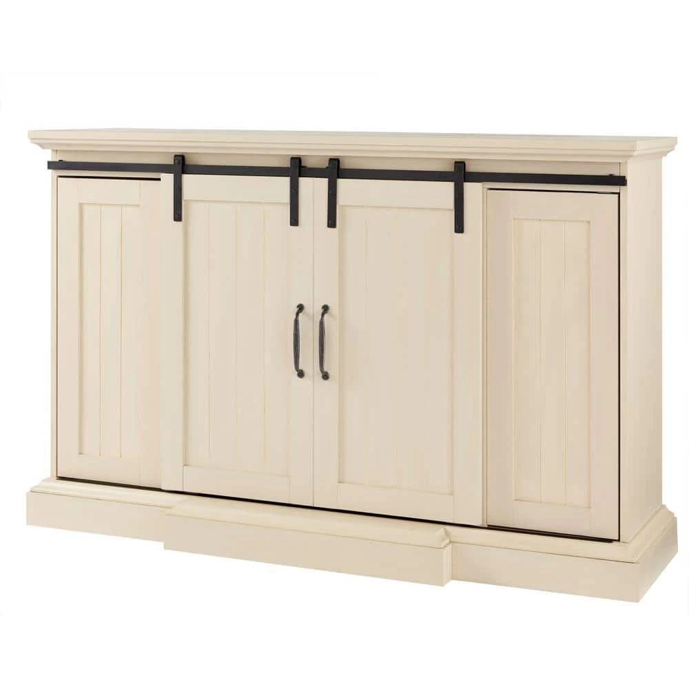 - Design features planked top and real sliding barn doors in ivory finish with pewter handles