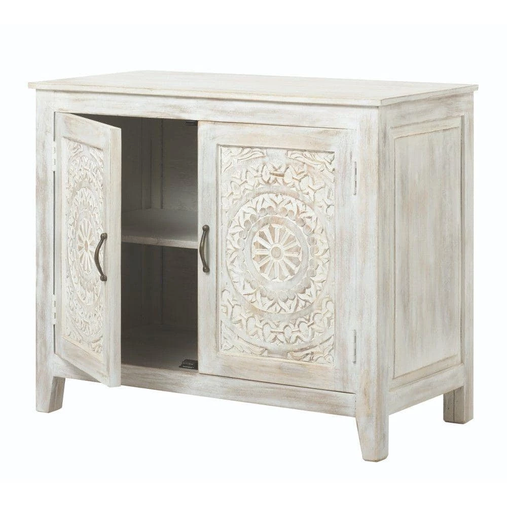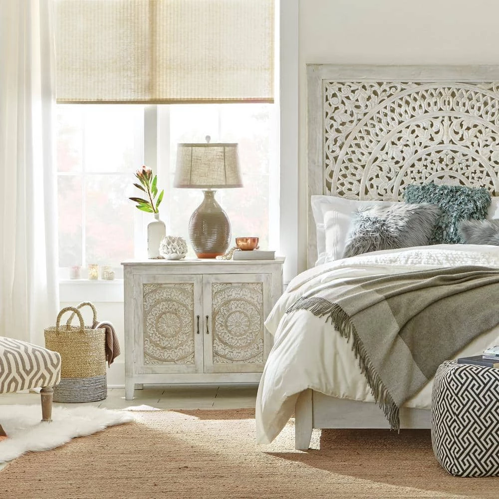 With an intricate medallion design carved into each door, our Chennai Nightstand is the perfect accessory for your bedroom. Mango wood in a whitewash finish gives this bedside table world-beat appeal. Try complementing it with vintage or cottage decor in muted colors. This wooden nightstand is roomy as well as stylish. Thanks to the removable interior shelf, you can fit anything inside, from books and remotes to your computer and nighttime slippers.
