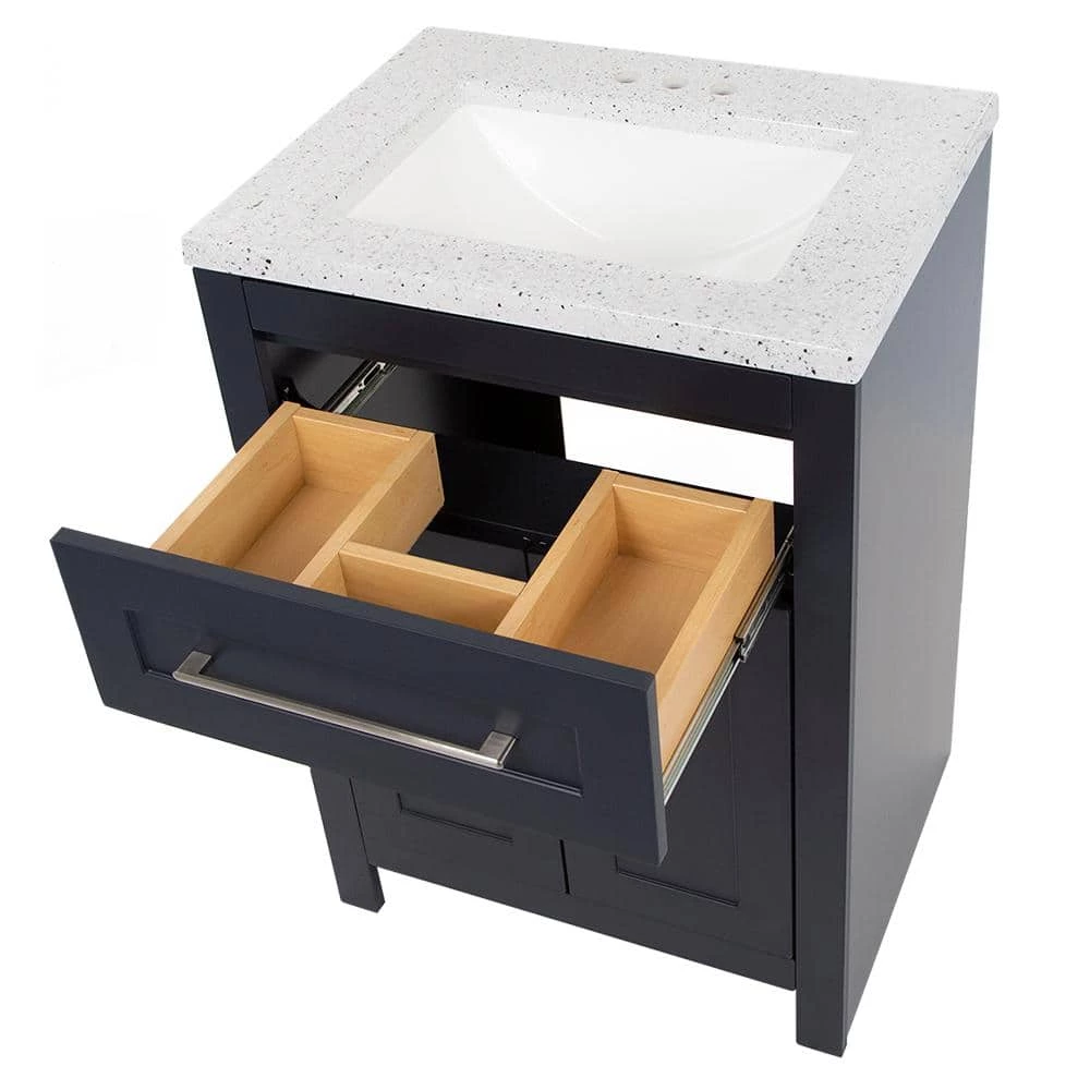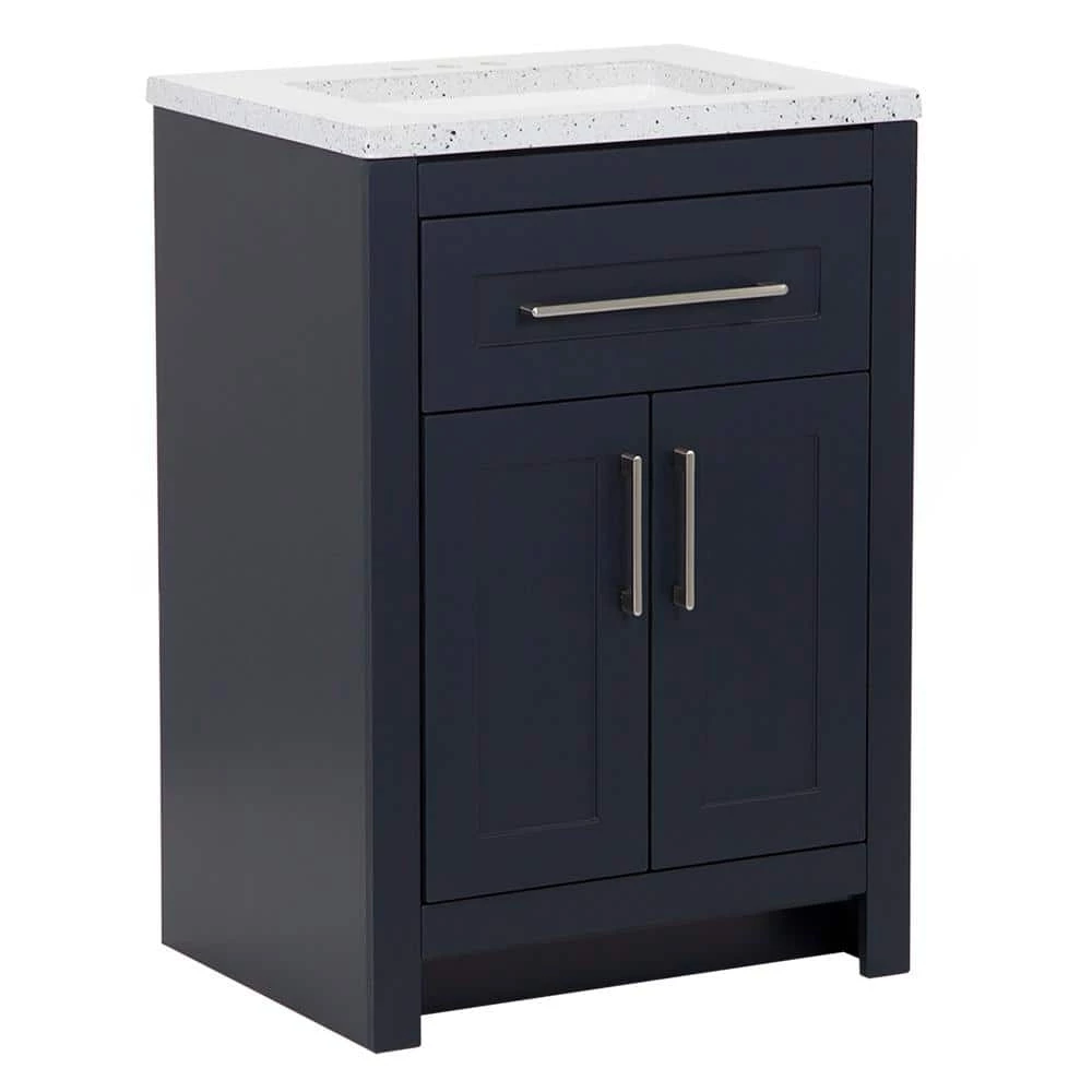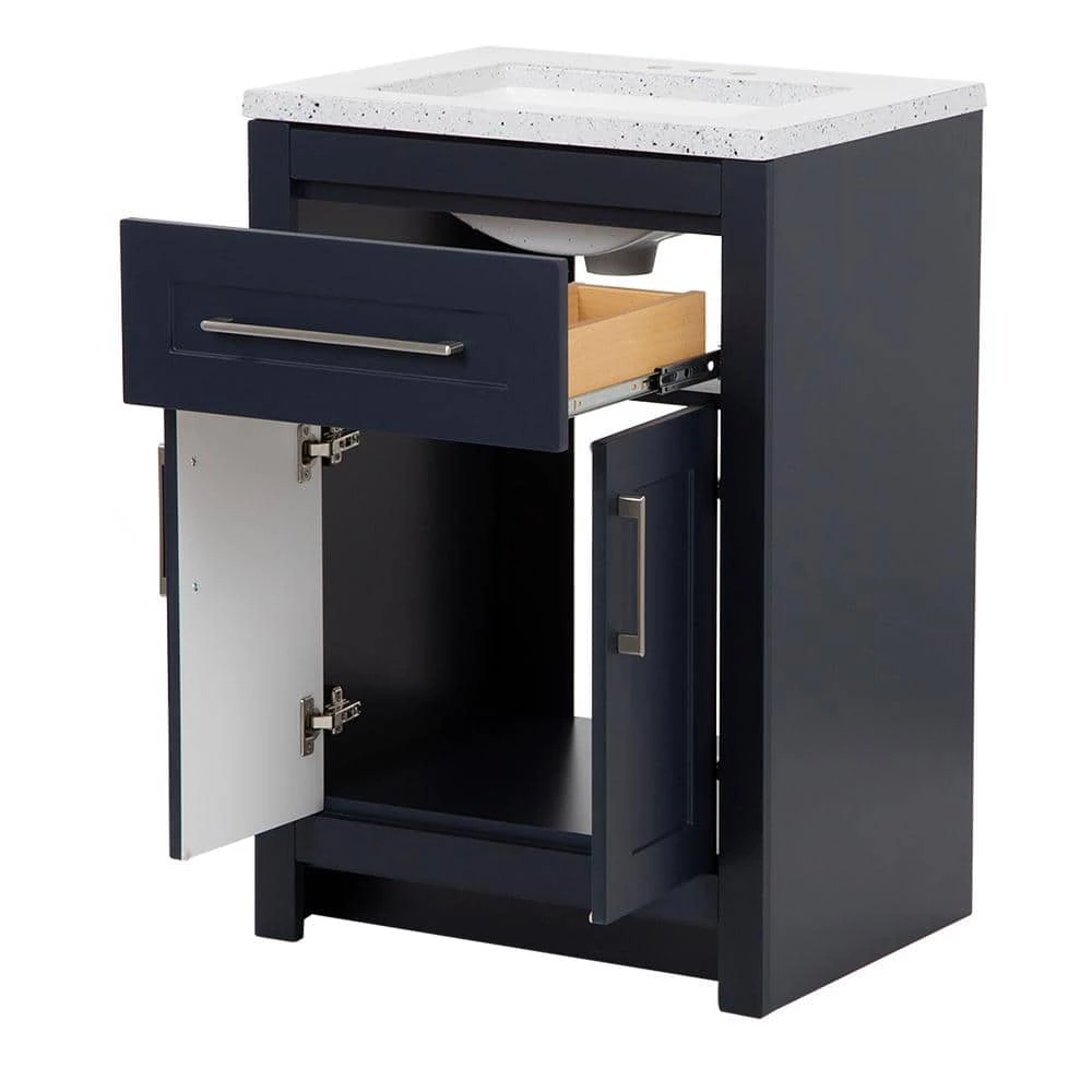 This 24.5 in. W Clady bathroom vanity in deep blue features a transitional design with inset Shaker-style drawer- and door-fronts, satin nickel hardware, and a granite-look cultured marble sink top. This freestanding vanity includes a 2-door cabinet with adjustable, soft-close hinges and a below-the-sink drawer with 3 compartments, giving you storage space for all your bath essentials. Durably built with a laminate furniture-board construction, this small bathroom cabinet includes a 1-piece silver ash cultured marble vanity top with an integrated rectangular white sink for a seamless look. The silver ash finish features a light gray base with gray, off-white, and reflective silver flecks for a granite-like look. This single-sink vanity top is predrilled for a 4 in. centerset faucet, allowing you to select a faucet that complements your style. Designed for quick and easy installation around your existing plumbing, this pre-assembled bathroom vanity set features an open-back design, a U-shaped drawer with an adjustable front, adjustable hinges, and an unattached vanity top.