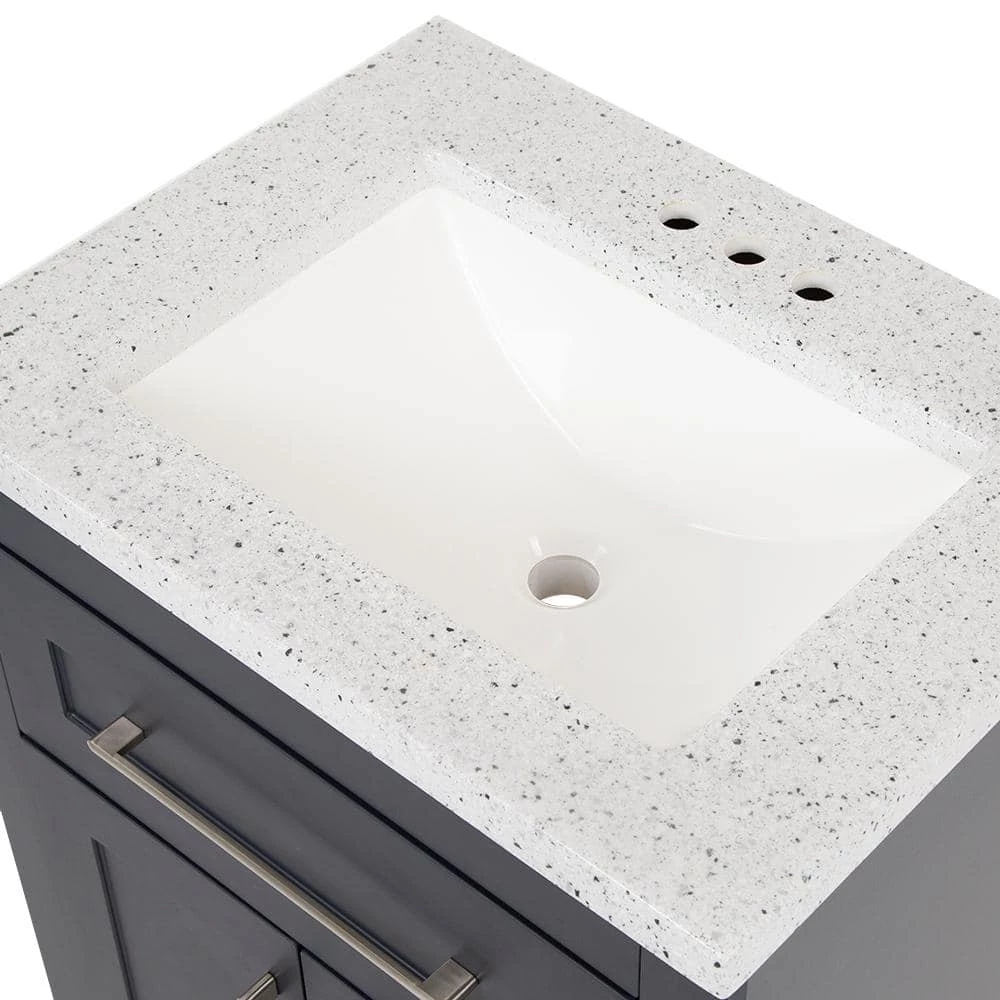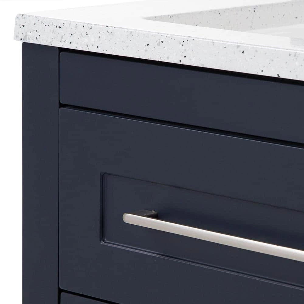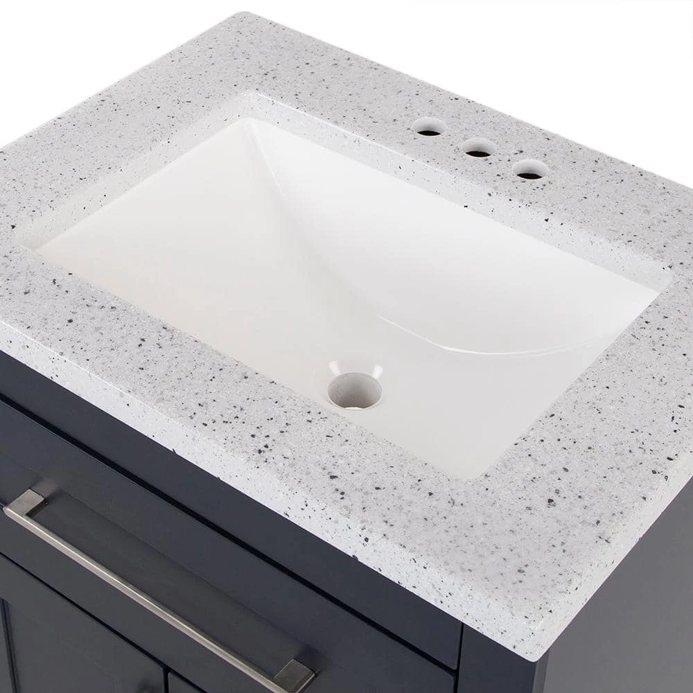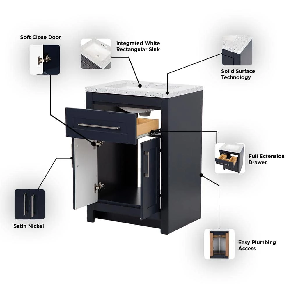 This 24.5 in. W Clady bathroom vanity in deep blue features a transitional design with inset Shaker-style drawer- and door-fronts, satin nickel hardware, and a granite-look cultured marble sink top. This freestanding vanity includes a 2-door cabinet with adjustable, soft-close hinges and a below-the-sink drawer with 3 compartments, giving you storage space for all your bath essentials. Durably built with a laminate furniture-board construction, this small bathroom cabinet includes a 1-piece silver ash cultured marble vanity top with an integrated rectangular white sink for a seamless look. The silver ash finish features a light gray base with gray, off-white, and reflective silver flecks for a granite-like look. This single-sink vanity top is predrilled for a 4 in. centerset faucet, allowing you to select a faucet that complements your style. Designed for quick and easy installation around your existing plumbing, this pre-assembled bathroom vanity set features an open-back design, a U-shaped drawer with an adjustable front, adjustable hinges, and an unattached vanity top.
