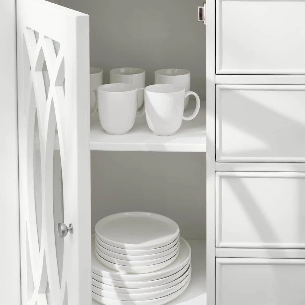 This modern farmhouse buffet from our Cliffmore Collection will add storage and style to your kitchen and dining room furniture. Its ample storage space can be used for flatware, dishes or even table linens. The buffet has 4 drawers and 2 large side storage cabinets that open to one adjustable shelf each. Glass-paneled doors gives an attractive farmhouse style in your dining area. Made of solid wood this buffet is sure to last. The standout elliptical patterned door design will be the only centerpiece needed.