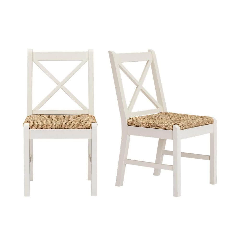 The Home Decorators Collection Dorsey dining chairs are a classic in the making. Modeled on a century-old farmhouse chair, ours have high X-backs and comfortable woven rush seats. The soft ivory hue refreshes any dining room space in an instant.