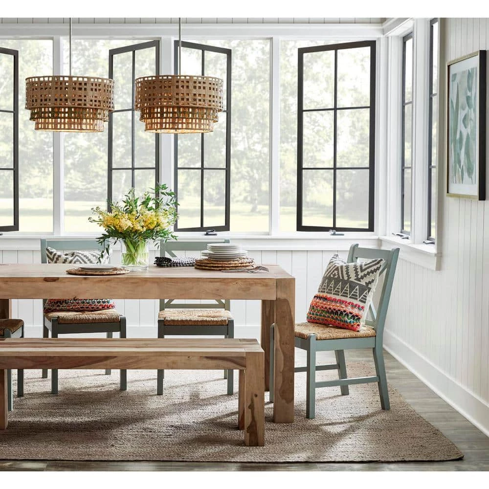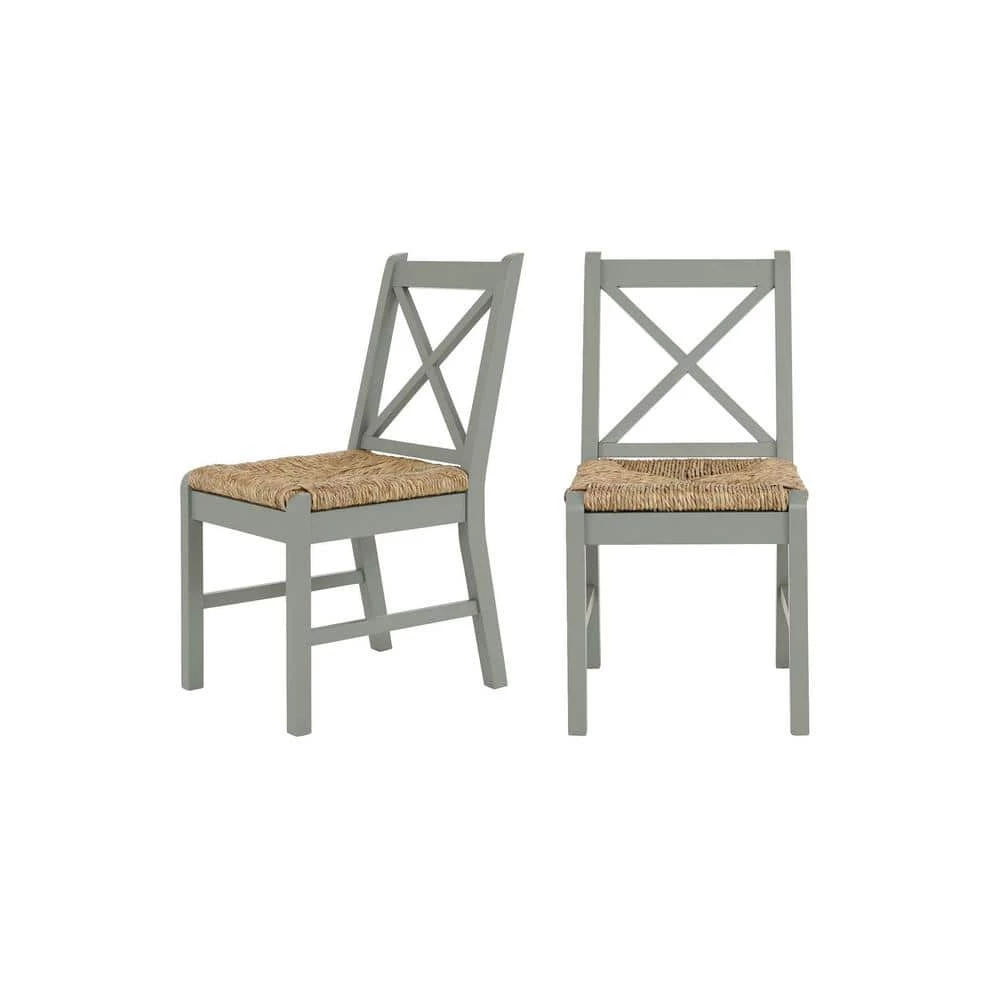The Home Decorators Collection Dorsey dining chairs are a classic in the making. Modeled on a century-old farmhouse chair, ours have high X-backs and comfortable woven rush seats. The soft green hue refreshes any dining room space in an instant.