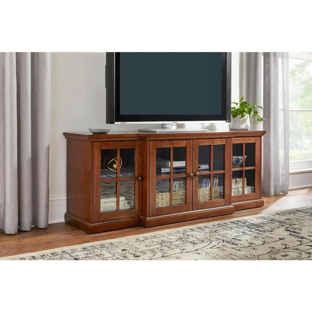 The timeless look of our Home Decorators Collection Edenridge TV stand brings classic charm home. The rectangular media cabinet’s four glass-paneled doors and light walnut finish add brightness to a space. Measuring over 5 ft. wide, the living room cabinet easily accommodates larger TVs. Three interior shelves stow audio and video components, and stacks of books.