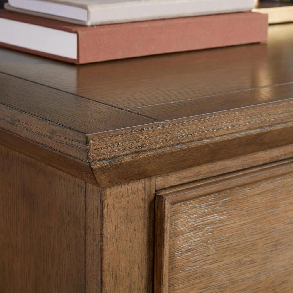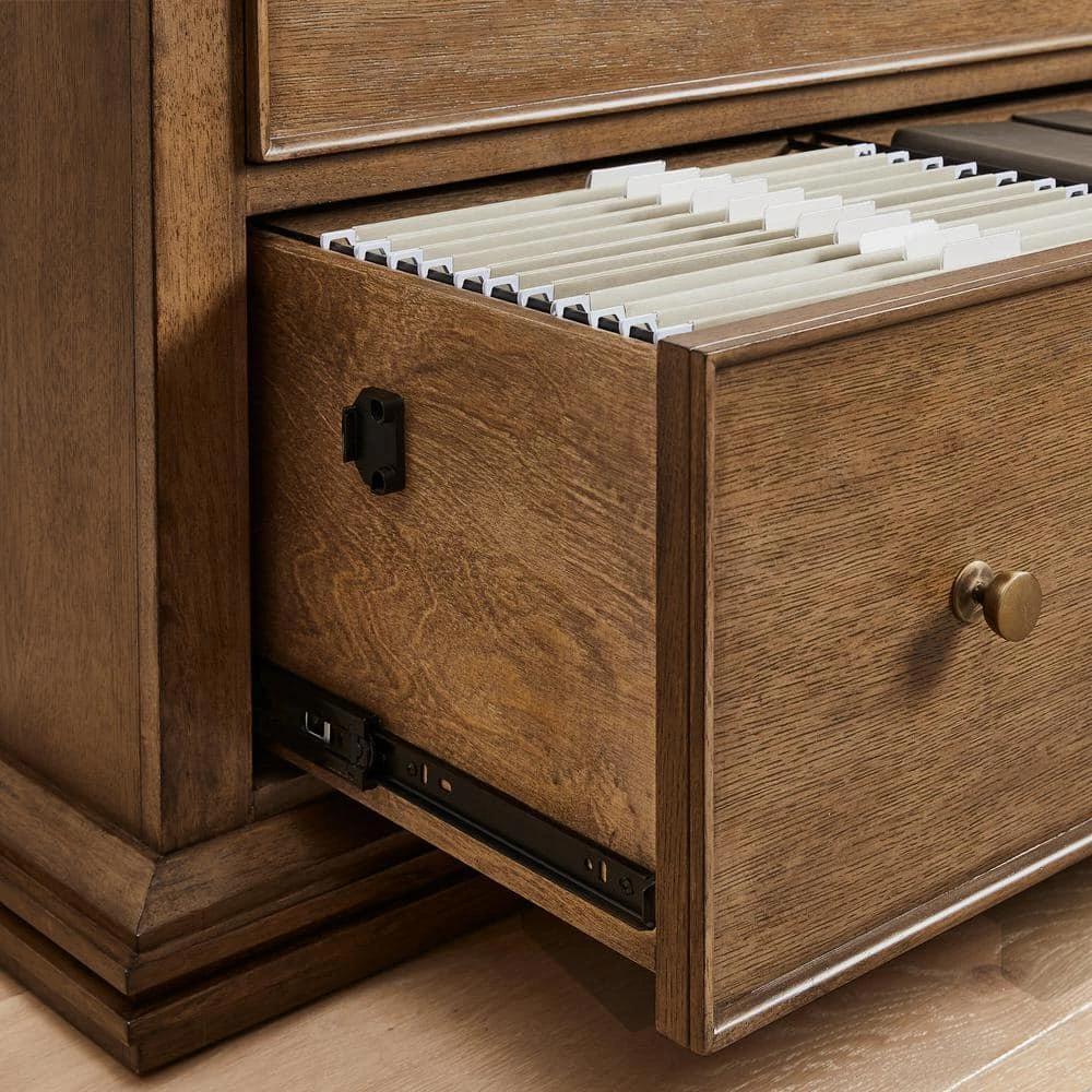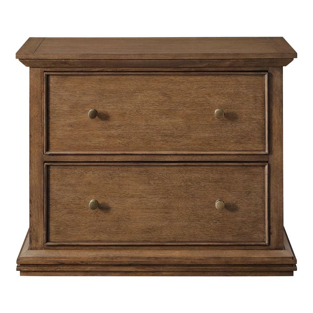 Keep your files sorted and stored safely in our 2-drawer Eldridge File Console. This wood file cabinet has a sturdy, classic farmhouse-inspired design, with angled molding at the top, fluted molding at the foot and recessed-panel drawers. Round hardware in an antique brass finish completes the classic look.