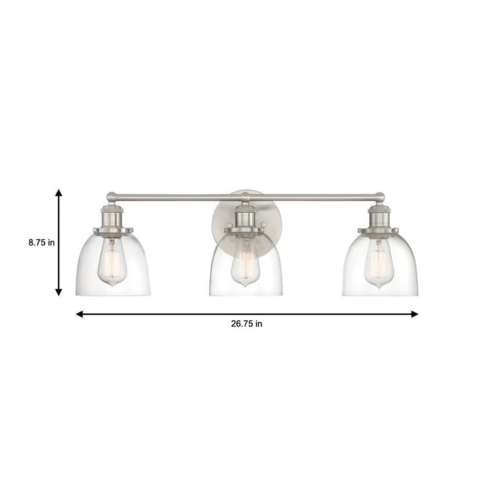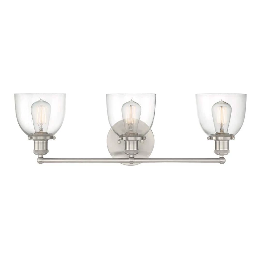 This Home Decorators Collection bath vanity light fixture offers smooth lines with a modern design. The protective brushed nickel finish provides a unique look to this light fixture. The clear glass shades provide clean illumination. These bath fixtures are built from steel to last for years to come and are designed for damp locations. These light fixtures come with everything you need for easy installation with the shade in the up or down position. This bathroom lighting vanity uses 3 screw based light bulbs up to 60-Watt each.