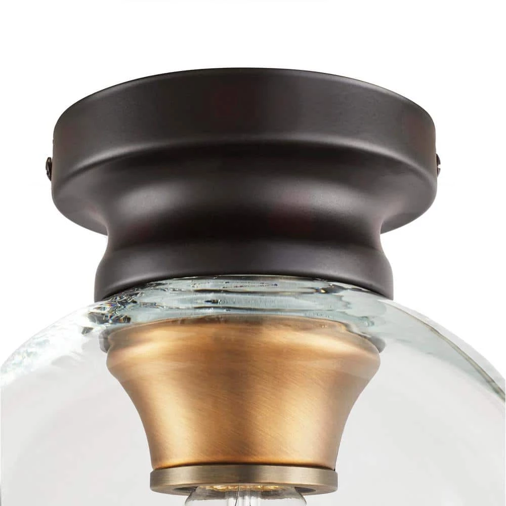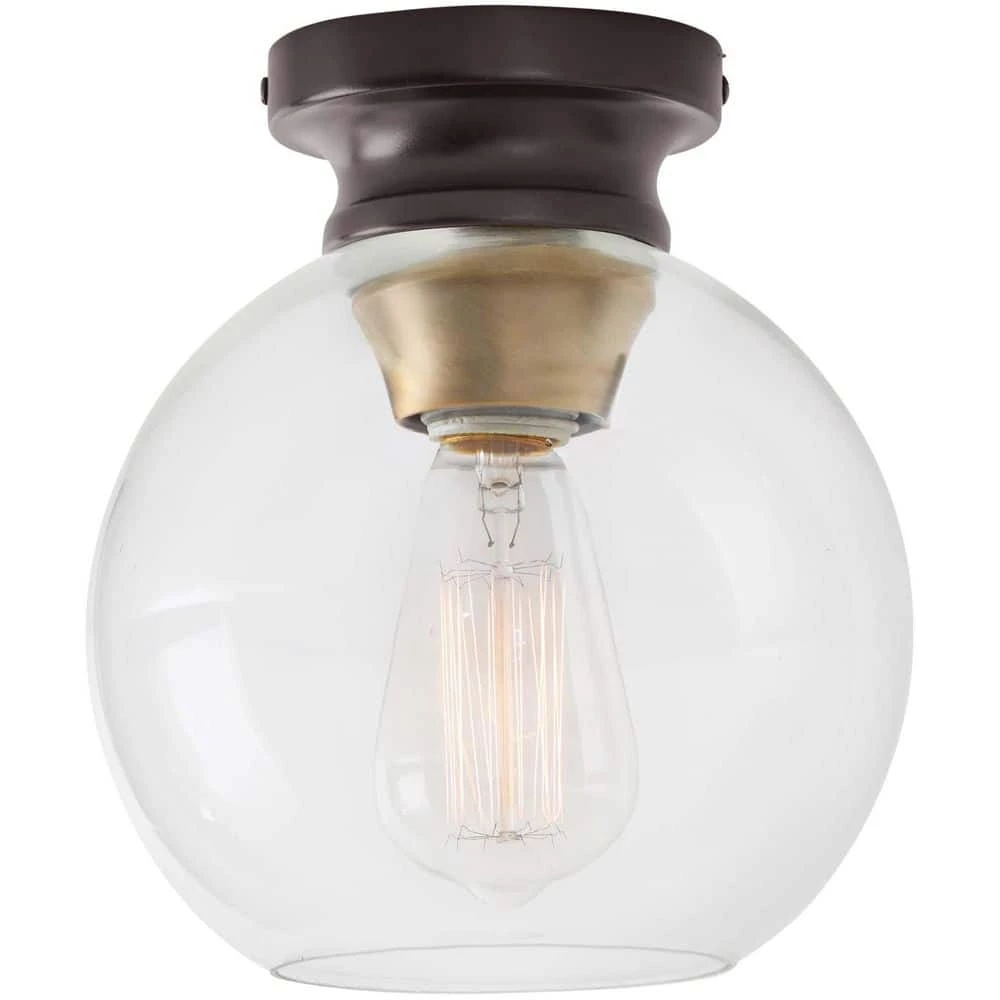This Home Decorators Collection ceiling light fixture offers a classic two tone metal design with clear rounded glass shade to highlight the filament bulb design of the 20th century industrial era. The use of rustic materials and warmth of this style has taken hold in today’s home interior light fixtures. The protective Artisan Bronze finish adds rustic sophistication to the ceiling light fixture. These Flush mounted ceiling lights are built from steel to last for years to come; they are backed by 5 year limited manufacturer’s warranty. These light fixtures install easily. This ceiling light uses 1 screw based filament style light bulbs up to 60-Watts; light bulbs are not included.