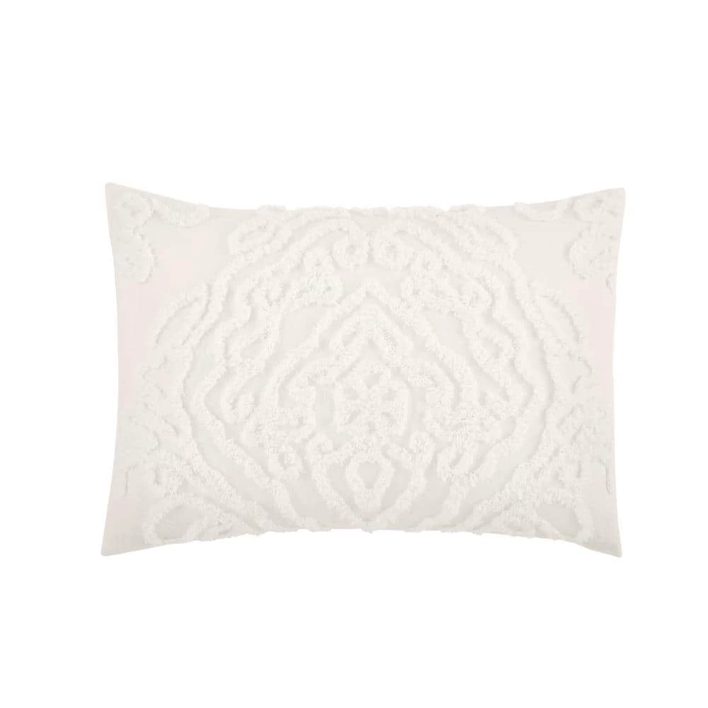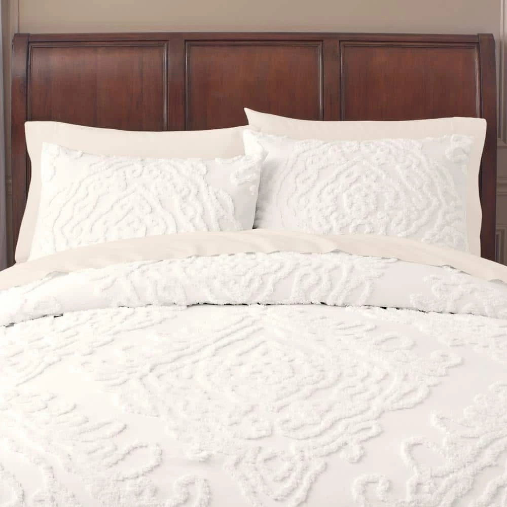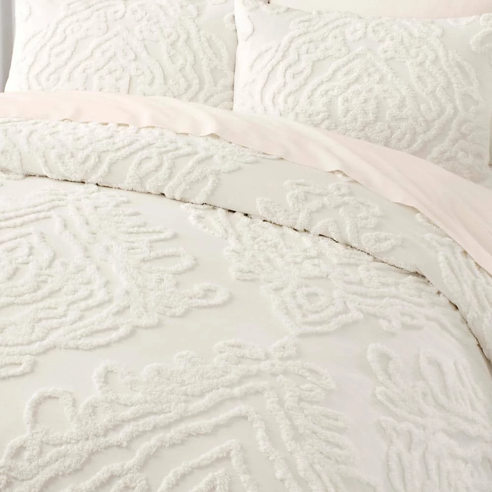 Tufted all-over with a grand motif medallion design, this Home Decorators Collection Fairhaven Ivory Cotton Duvet Cover Set brings fresh style and sophistication to your space. Offered in a beautiful neutral tone, this ivory duvet cover can be dressed up with accent throw pillows and blankets, or stand alone by itself as the tufted texture adds visual interest on it’s own. Made with 100% cotton for ultimate comfort, this luxury duvet cover set is soft to the touch and durable for every day use. The button closure and corner ties keep your duvet insert or comforter in place without bunching. This 3-piece set includes one full/queen duvet cover and two standard shams, and its machine washable construction is effortless to maintain. You can be confident in your purchase as this set is STANDARD 100 by OEKO-TEX certified, meaning it has been independently tested for harmful substances according to strict scientific criteria that go beyond global legal regulations.