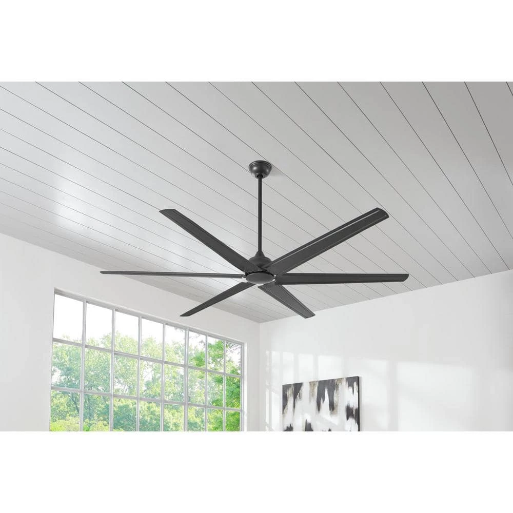 Perfect for large indoor spaces, this 84 in. ceiling fan from the Home Decorators Collection will infuse the room with modern industrial flair. It features six silver metal blades and a natural iron finish. A decorative canopy ring and coupling cover conceal exposed screws, while a threaded downrod adds stability. It will not disturb you and uses only 31 watts at its highest speed. Choose from nine speeds. The fan includes a handheld remote. DC motor fans are 70% more energy efficient than AC motor fans (when comparing efficiency (CFM/W) of DC vs AC motors in published FTC Energy Guides for ceiling fans).
