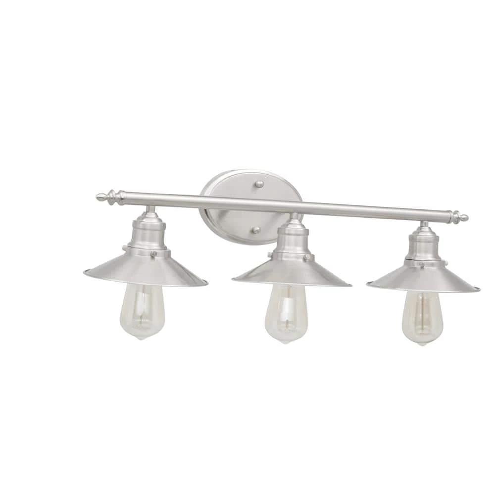 Hampton Bay’s Glenhurst Collection exhibits bold, retro vanity lighting that will add an old-fashioned industrial feel to bathroom and powder room areas. The perfect accent piece for your vanity area, each of the three unique light sockets features a domed metal shade in a classic brushed nickel finish. This fixture is mounted with a stylish oval back plate and has straight arm detail holding the shades in place. A reversible mounting feature gives you the option of installing this light with the shades facing upwards or downwards. Showcase this fixture with vintage Edison style filament bulbs (not included) to add a warm glow to your space.
