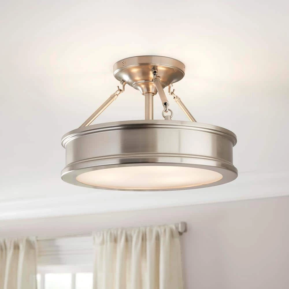 Update your decor with this sleek semi flush mount design from the Home Decorators Collection. Presenting a clean silhouette that needs little embellishment. Hook-and-rod supports join the drum-shaped shade to the canopy, all in a rich Brushed Nickel finish. Subtly tiered edges add a touch of detail while below, a Clear outside and Frosted inside glass provides a smooth wash of brilliant illumination. The tasteful, traditional design will complement the decor in any room.