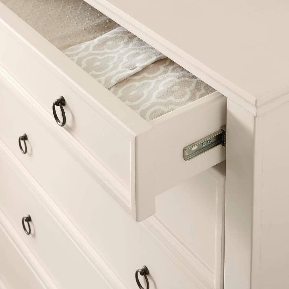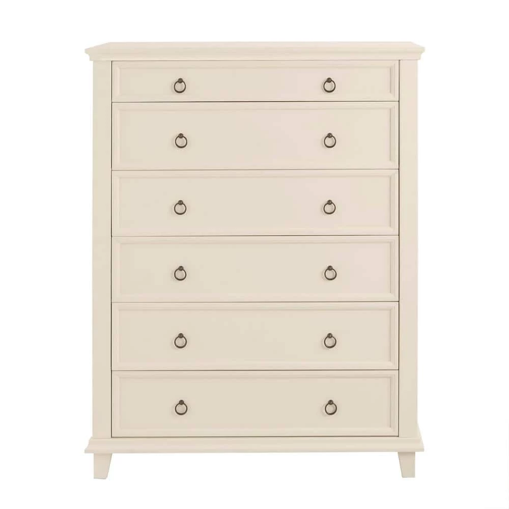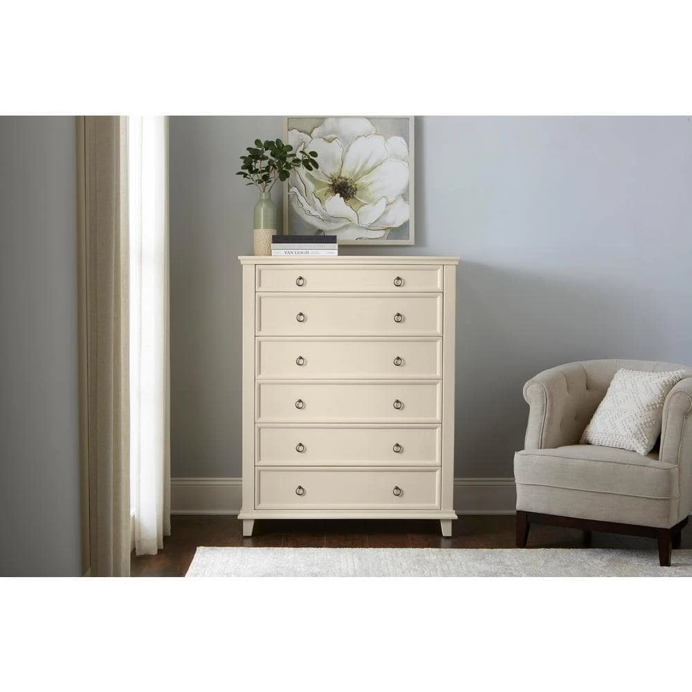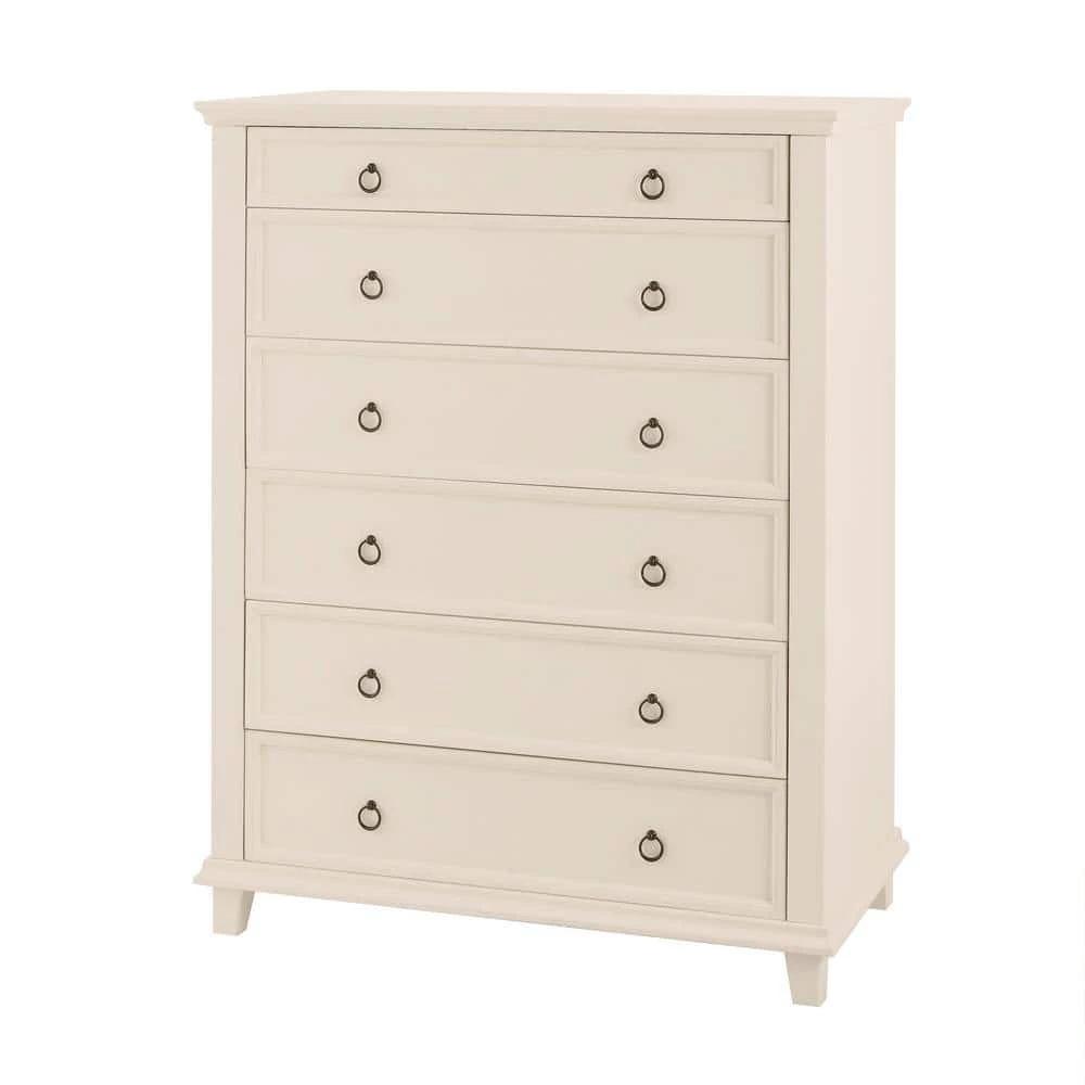 Get your room in order with this Grantley ivory wood six-drawer chest of drawers. Six drawers provide an ample amount of space for your pants, shirts and socks, while the solid wood construction delivers dependable lasting use. A handsome ivory finish supplies a neutral palette that easily complements your decor style. Set up this Grantley ivory wood six-drawer chest of drawers in your bedroom or dressing room to enjoy streamlined, organized storage.