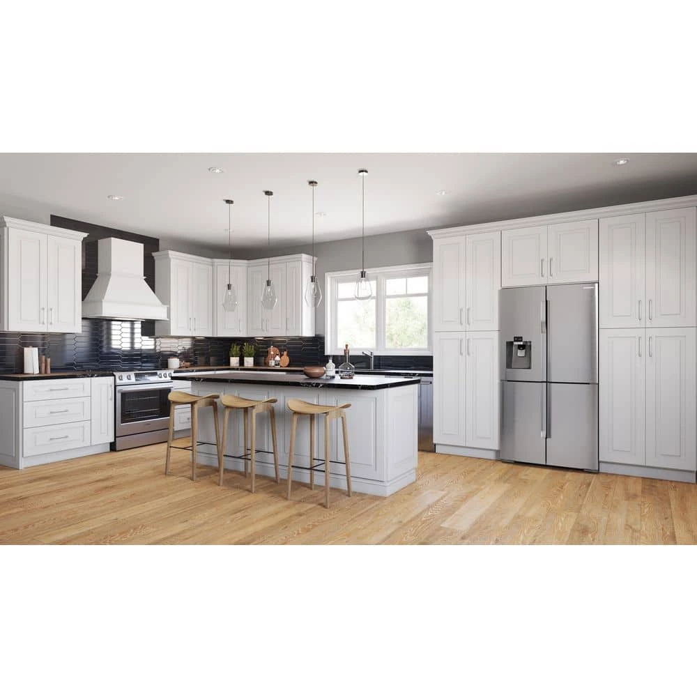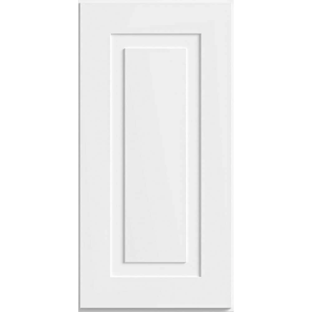 Grayson Pacific White from Home Decorators Collection is a Transitional Shaker door style featuring a square raised center panel. 3/4 in. thick MDF door with 3 in. outer styles and rails. Bright White painted finish. Decorative drawer fronts standard. Brighten your space and create a transitional look for many years. This collection features as soft close doors and drawers and full depth shelves.