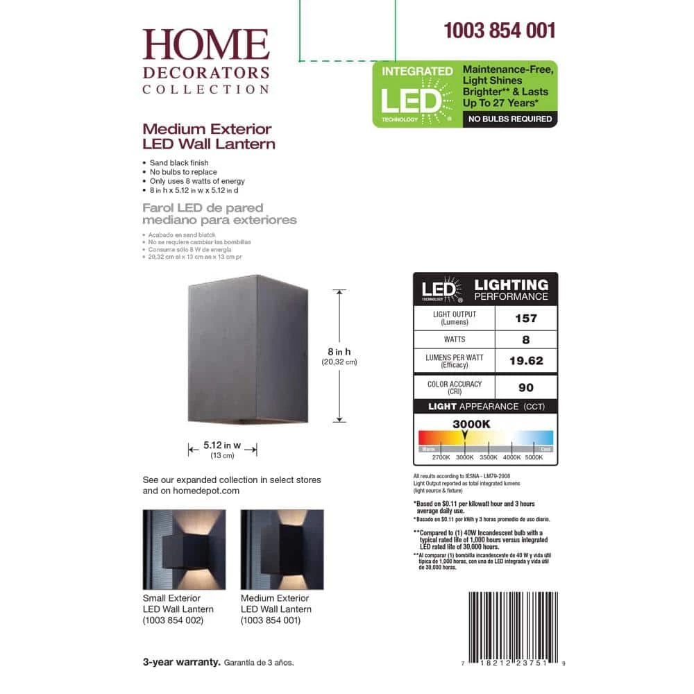 The Home Decorators Collection LED Outdoor Wall Mount comes in a sand black finish with a clear glass. This modern LED outdoor wall mount will bring a fresh clean appearance that will complement the exterior decor of your home. It uses and integrated LED module and does not require ever having to replace light bulbs virtually eliminates maintenance.