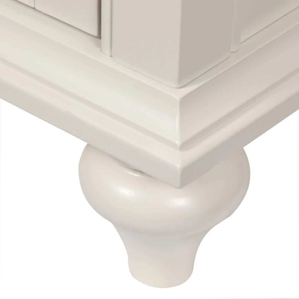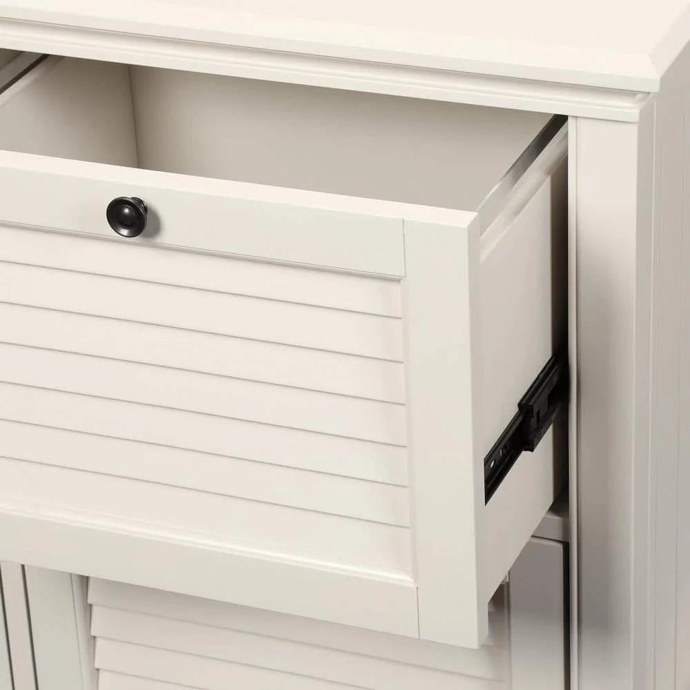 Keep your home or office organized with this Hamilton Four-Drawer File Cabinet. It features a classic design with tulip bun feet, a white finish and louvered details. It has plenty of space for your letter- and legal-sized documents with four file drawers on full-extension ball bearing glides.
