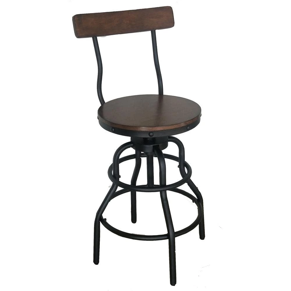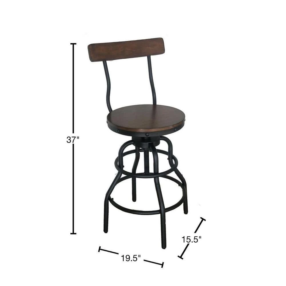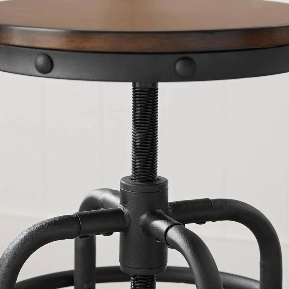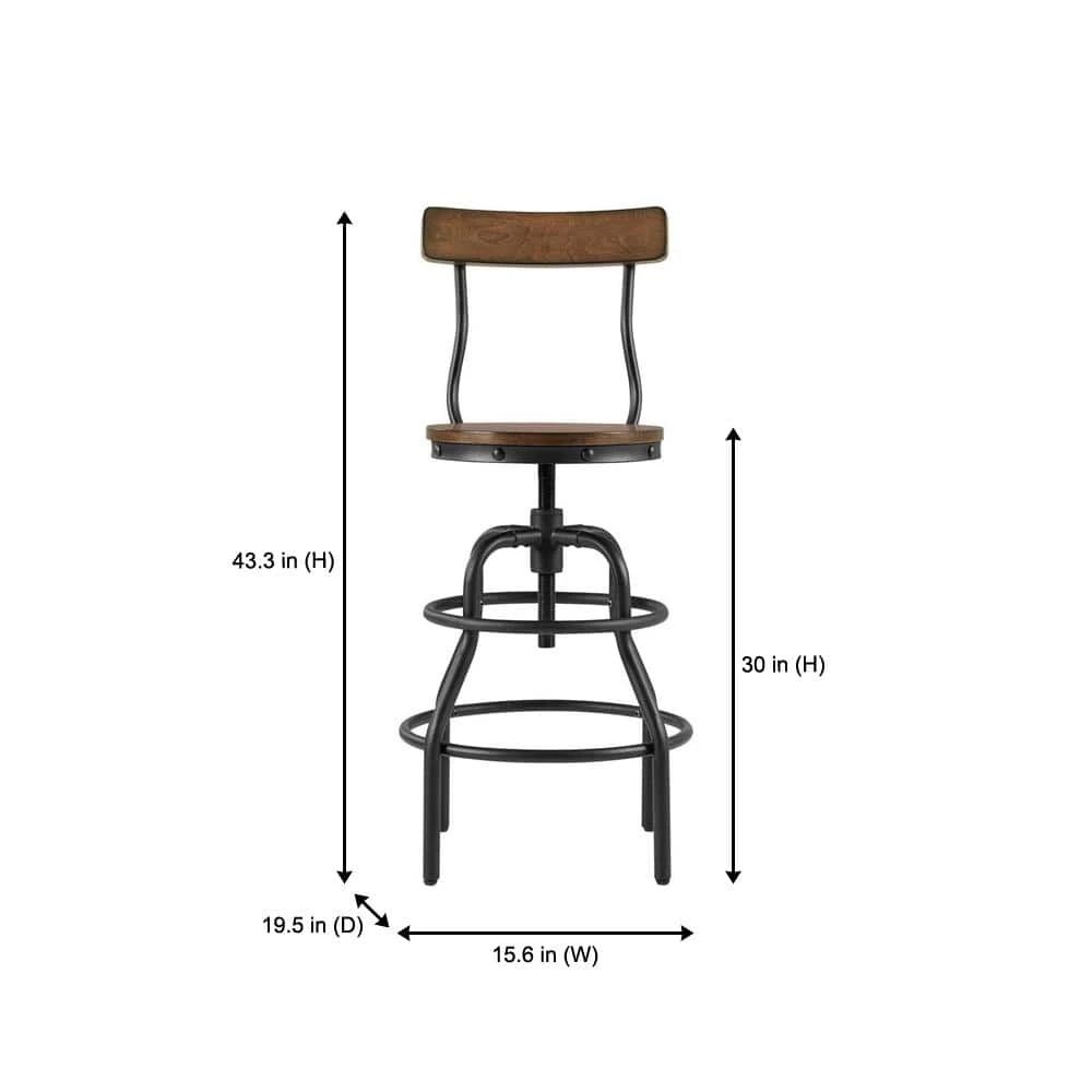 The Home Decorators Collection Industrial Hamrick Stool is durably crafted of iron with an adjustable seat height of 24 in. to 30 in. The wood seat, in a rich brown finish, features a swivel motion for added convenience of raising the stool to your desired height. The subtle curve of the twin back braces echo the curves of the sturdy base. The seat back is also curved to support your back comfortably. This striking stool design is the perfect industrial addition to your home office, bar or kitchen.