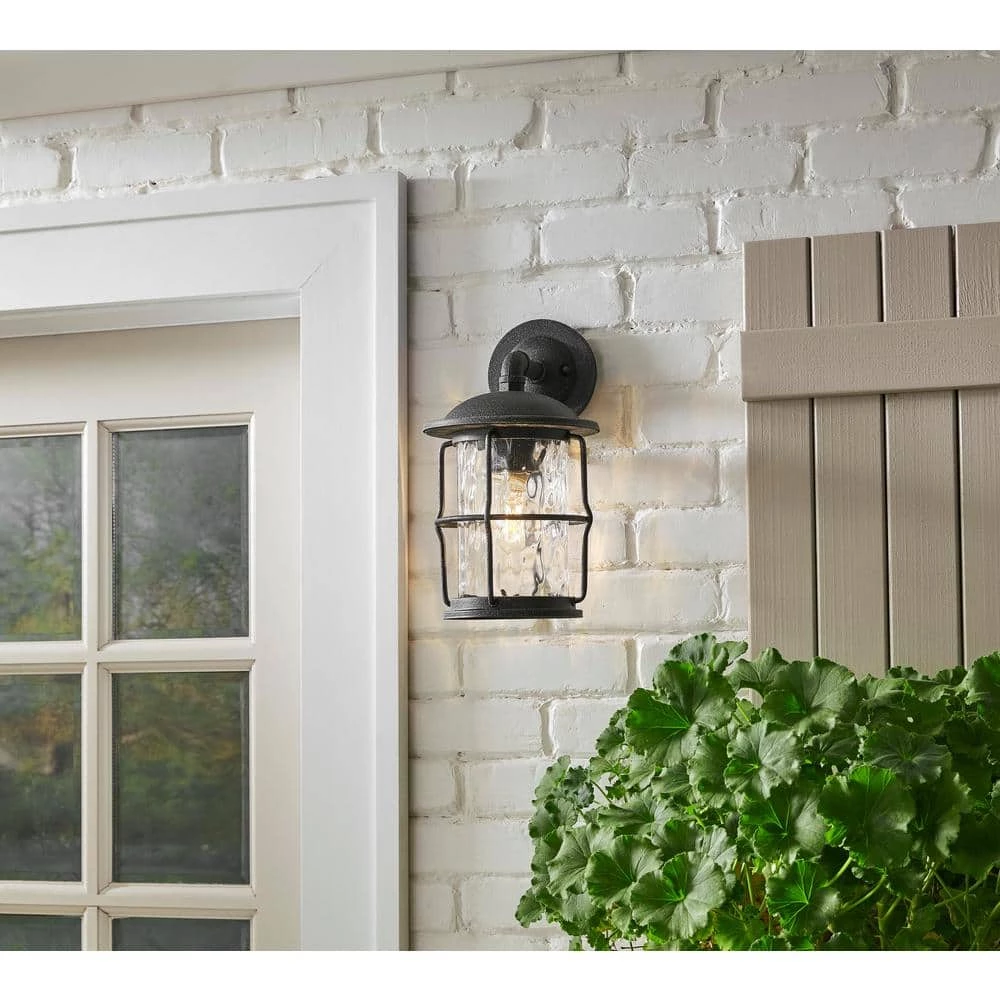 This one-light wall lantern is sure to enhance any home’s curb appeal. The frame features a round, cylinder-shaped water glass shade. Fixture is finished in a Gilded Iron.