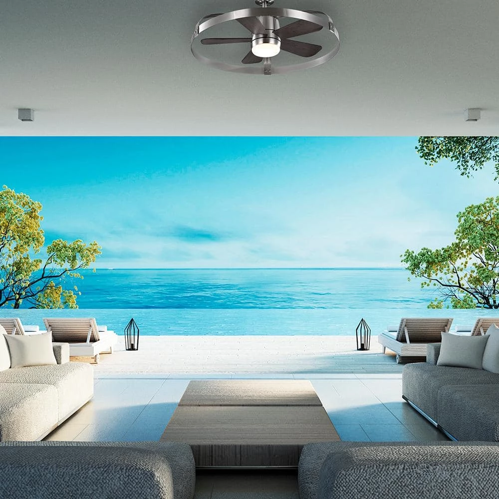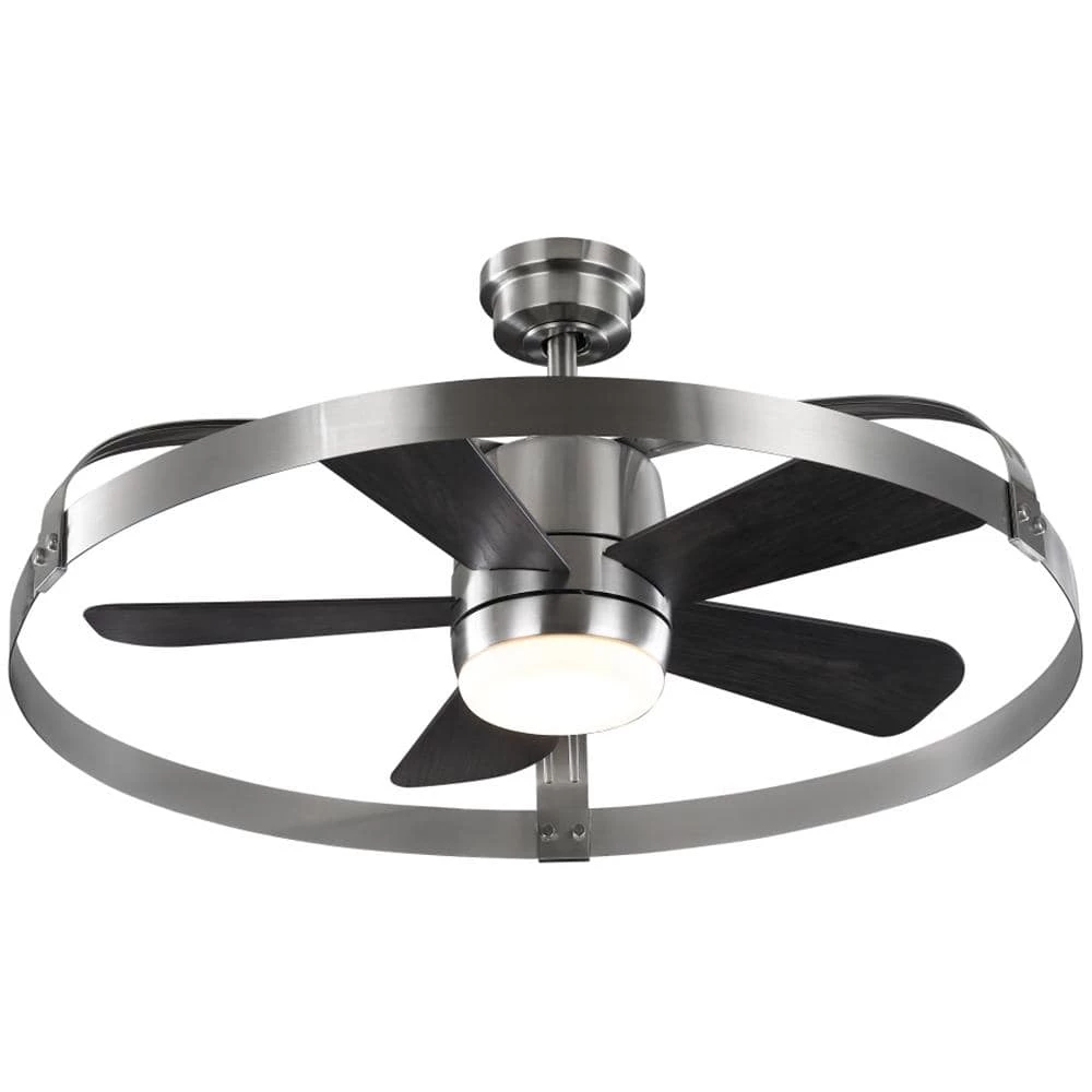 Make a room cooler with this Harrington 36-in. LED ceiling fan. Damp-rated for covered outdoor installation, it offers a dimmable integrated LED module light kit. A 3-speed reversible motor allows maximum airflow. To make installation easy, it comes with a slide-on mounting bracket. A brushed nickel finish and reversible espresso/dark wash oak blades create a modern look.