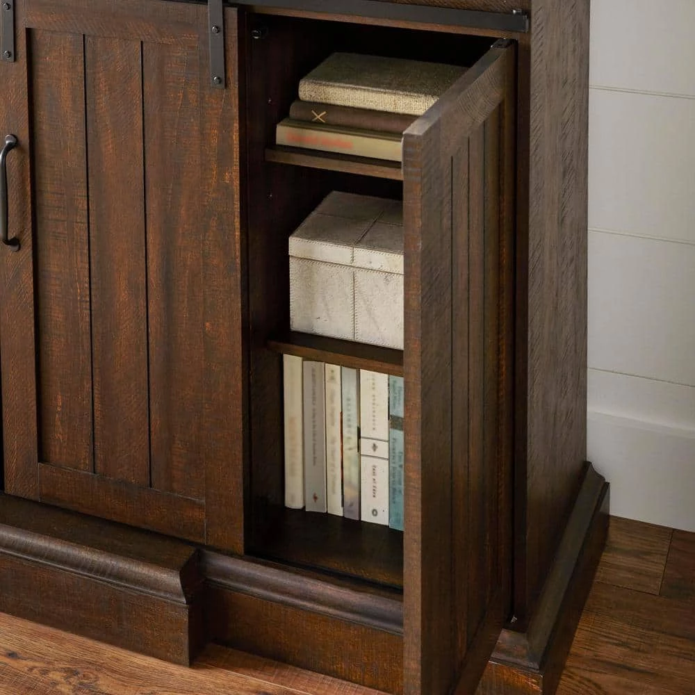 - 2 sliding barn doors and 2 touch latch doors conceal side cabinets with 2 adjustable shelves each