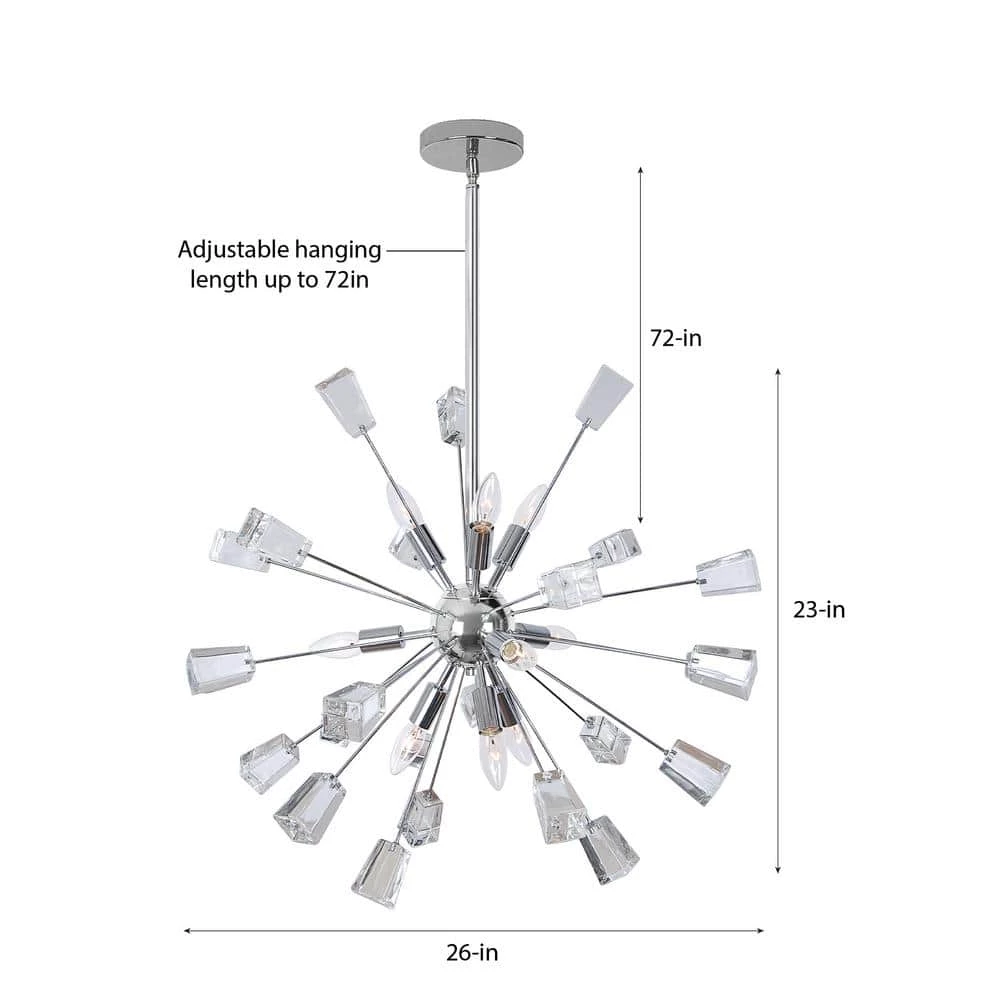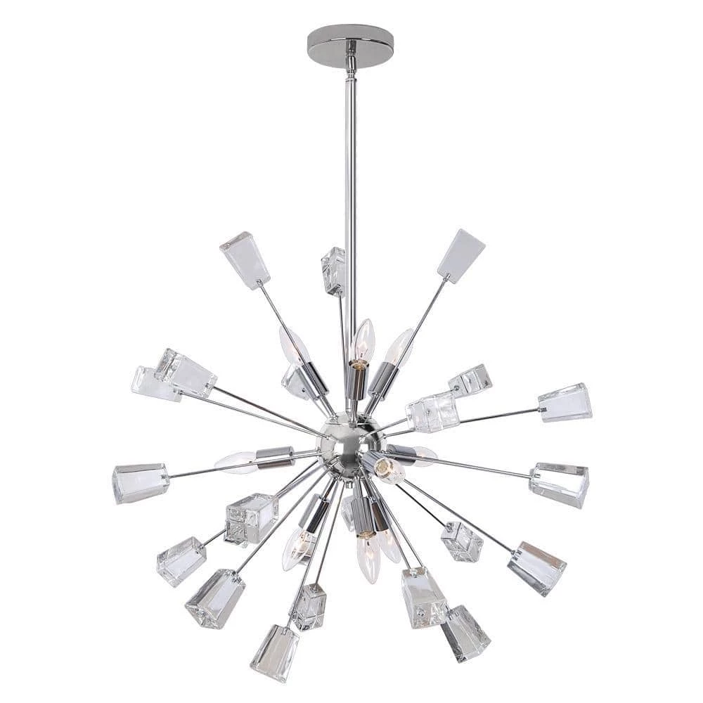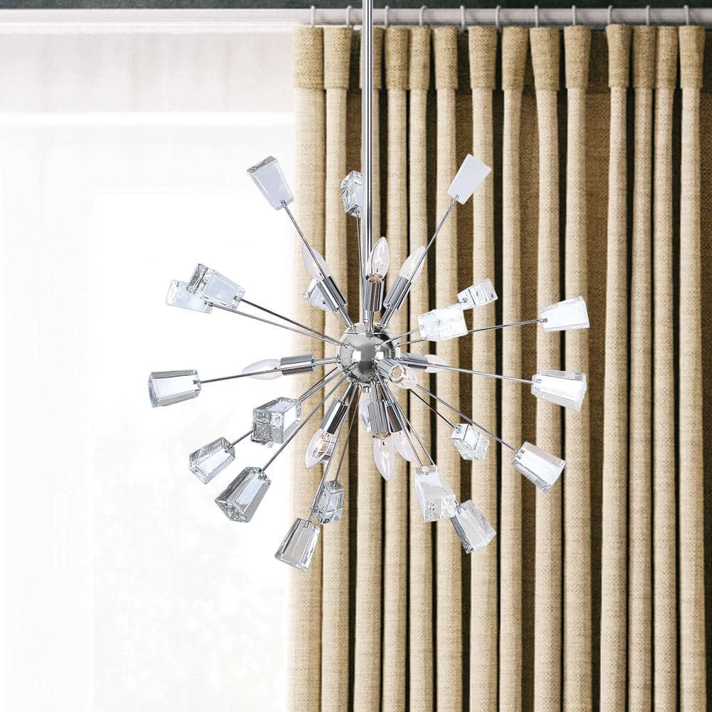 The 9-Light Sputnik Chandelier is truly a statement piece with its large crystals and polished chrome finish. The fixture will light up your room, filtering the light through over 20 K9 quality crystals. This is the perfect fixture to give your space a designer look.
