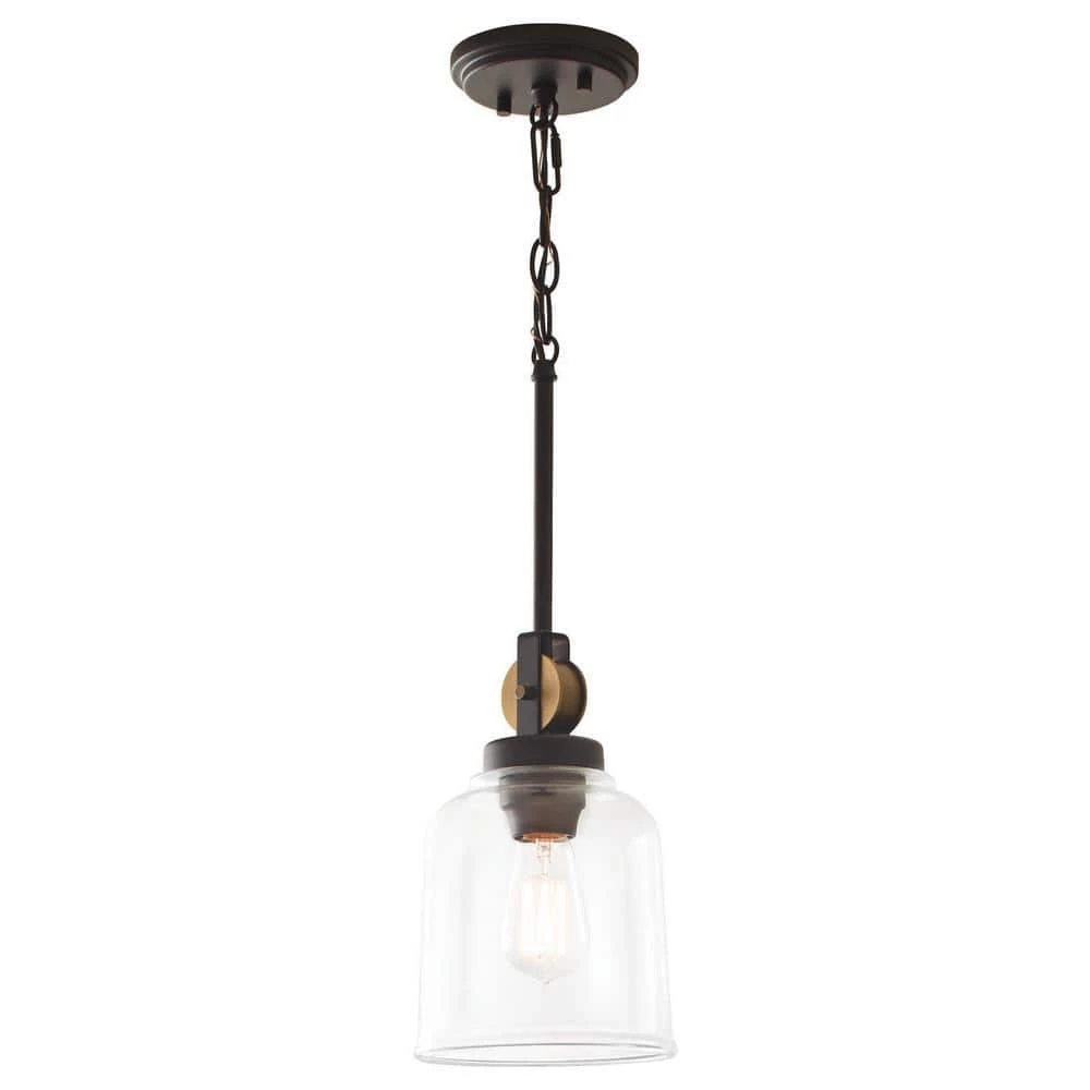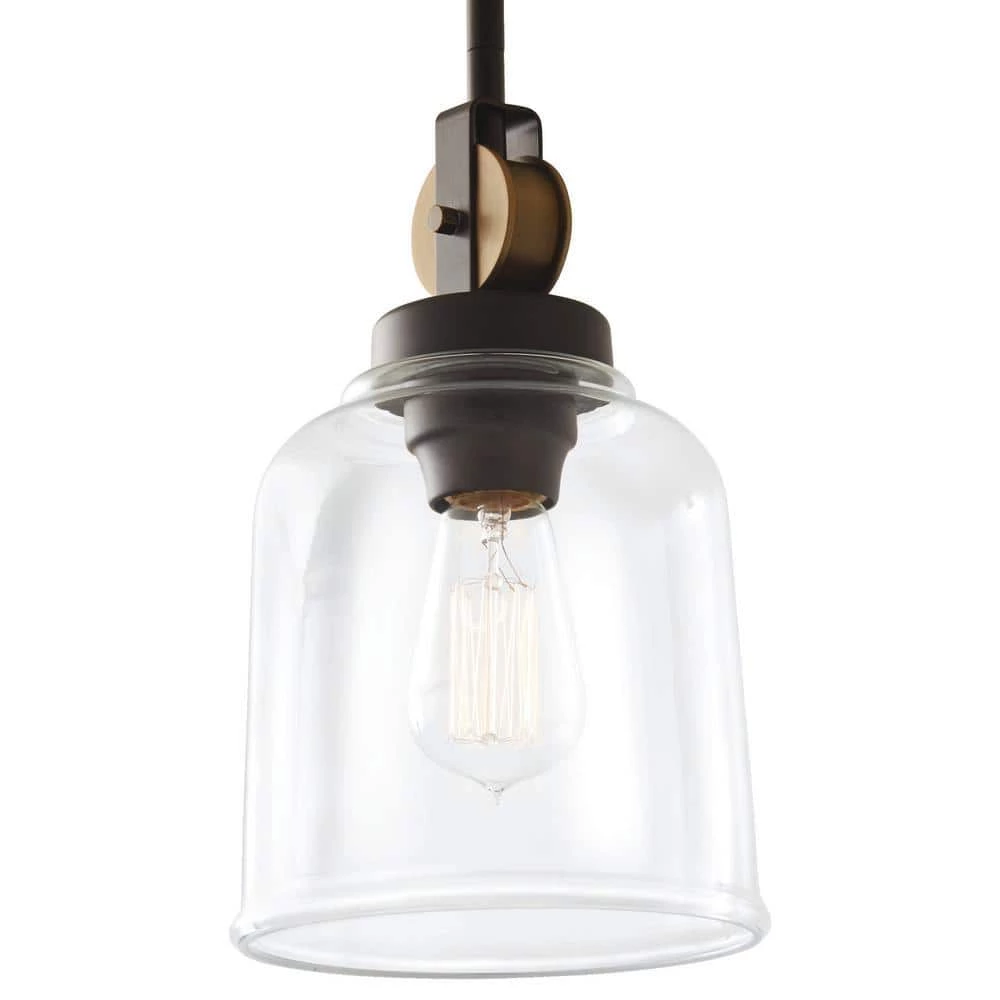 Influenced by a mid-20th century vintage industrial design, the Knollwood lighting collection has clear glass shades that will perfectly highlight the classic Edison bulb. The 1-light antique bronze mini-pendant offers transitional style with timeless appeal. Incandescent medium-base blubs not included.