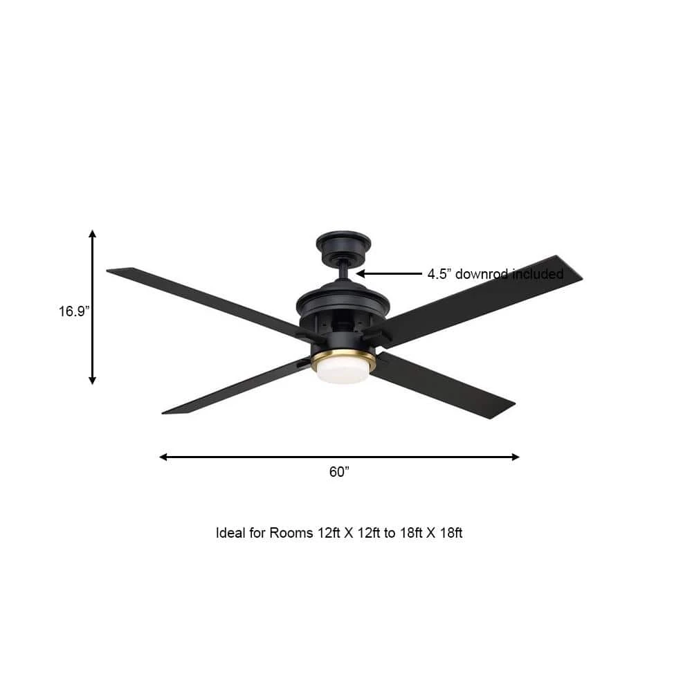 Easily integrate fan and light control into your Amazon or Google smart home system with this Bond ceiling fan bundle. The Bond remote hub pairs with Alexa or Google Home to add voice control convenience to your ceiling fan. The included Bond remote hub is shipped separately. The Lincolnshire 60 in. LED Matte Black Ceiling Fan has a very interesting housing where the it spins along with the blades. The reversible matte black and walnut blades will help coordinate within your rooms decor. The 14-Watt Samsung LED light source is both energy efficient and long-life span of 50,000-hours. The remote control operates the light and speed functions and includes batteries. This fans also comes with a lifetime motor warranty. DC motor fans are 70% more energy efficient than AC motor fans (when comparing efficiency (CFM/W) of DC vs AC motors in published FTC Energy Guides for ceiling fans).
