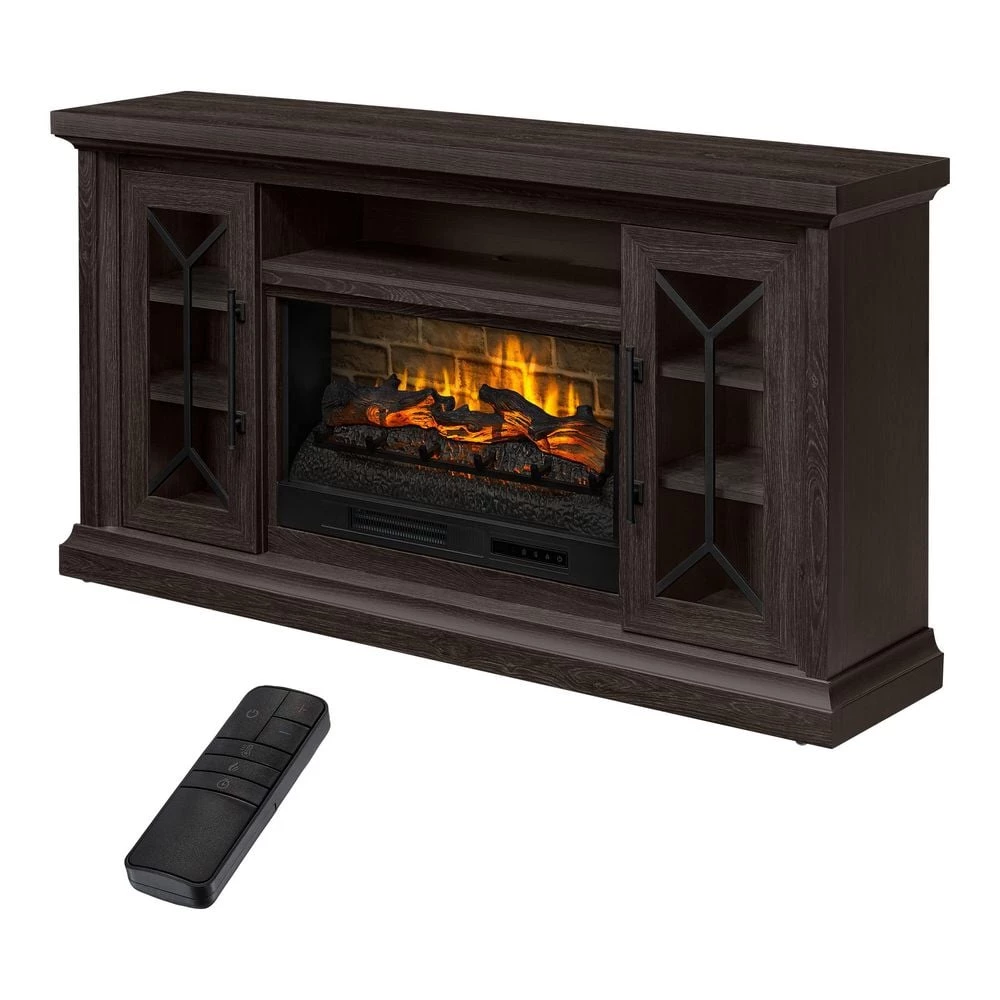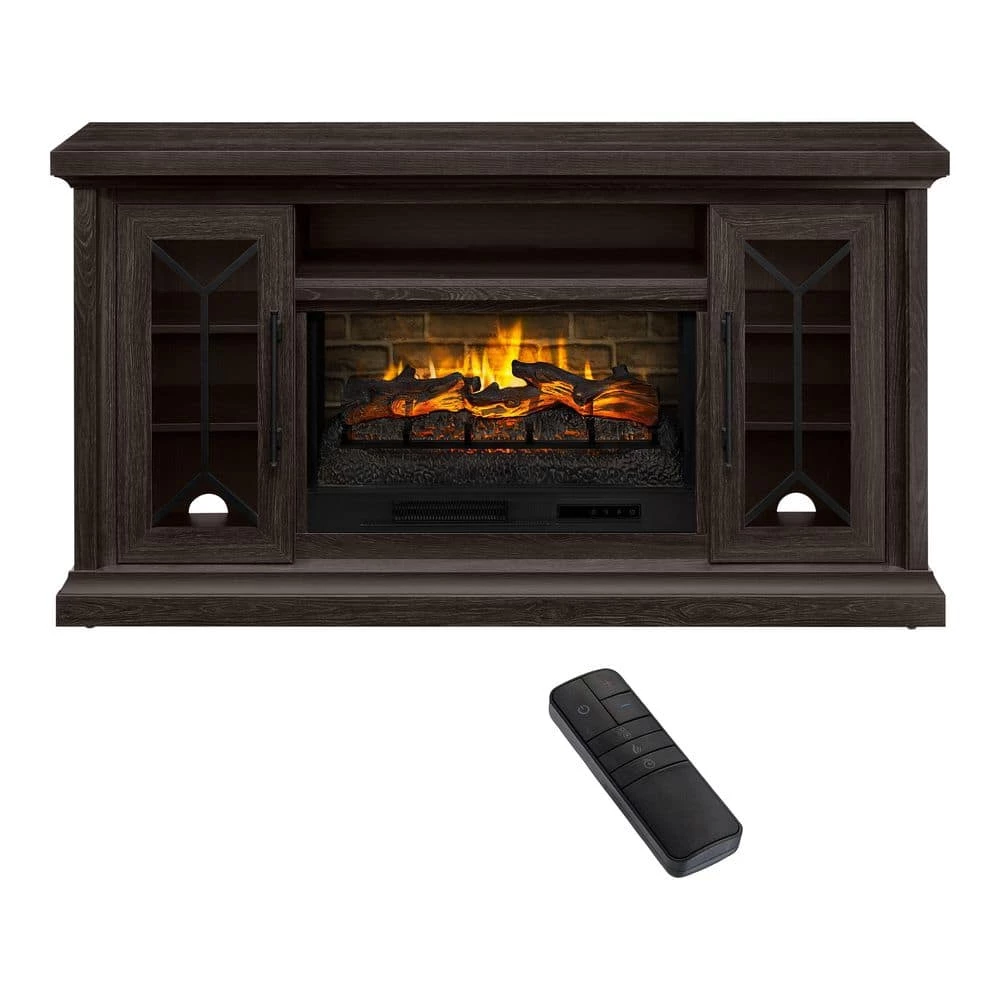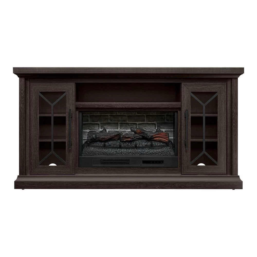 Gather your friends and family around the warmth and comfort of a fireplace with this 68 in. Electric Fireplace TV Stand. Play games, make memories, enjoy a date night, all in front of the rich comfort and radiating warmth of the realistic logs and 3D flames with ember effects, thanks to the QuantumFlame technology. Transform any room in your home into a sanctuary with the energy-efficient LED flames that have adjustable heights. Take movie night to the next level – the TV stand can hold most flat-panel TVs up to 80 in. – and watch your favorites while relaxing in front of the fireplace. Customize your console using glass or wood interchangeable door panels, and adjustable interior shelves. The 5,200 BTU/hr. infrared quartz heater can heat up to 1,000 sq. ft. using an adjustable thermostat range of 62°F to 82°F. But, don’t worry if it’s summer and warm. You can enjoy a cozy fire all year long, with or without heat, and control the fire using a handy remote. This transitional fireplace TV stand is well-constructed, made even more stunning with the rich Dark Chocolate finish. Its open compartment for audio/video components makes it easy to set up and access your system. The freestanding electric fireplace TV stand requires assembly and conveniently plugs into any standard home electrical outlet (max 120-Volt and 60 Hz).