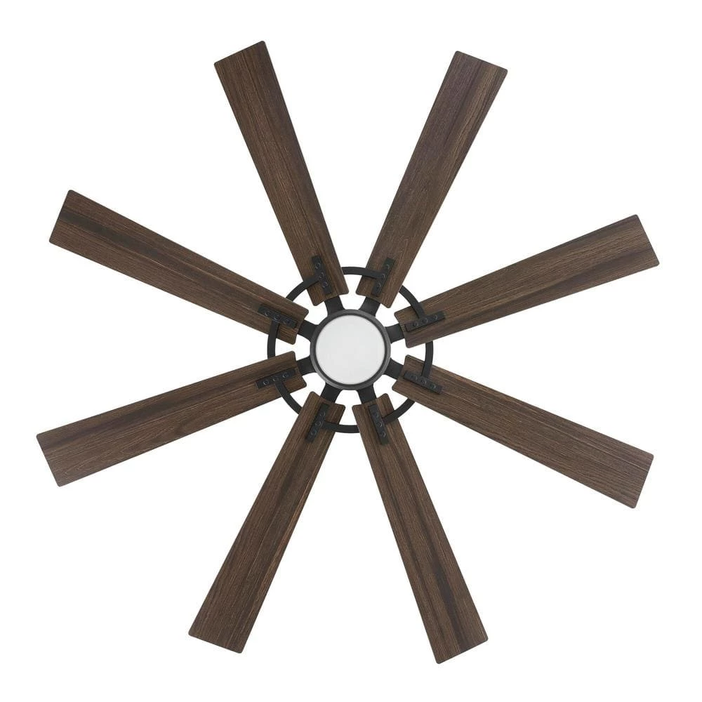 Stunning. Wow. Incredible. Just some of the comments you may hear when friends and family see your new 60 in. Makenna ceiling fan by Home Decorators Collection. This gorgeous windmill style fan features a powerful DC motor and 8 reversible blades to circulate air in great room spaces and covered outdoor locations like porches and patios. The fan’s stark matte black finish is complemented with a frosted glass light shade and reversible blades in distressed walnut and natural aged oak finishes to blend with many of today’s decor trends. The versatile integrated LED light is dimmable and allows you to choose between is different color temperature settings ranging from warm white (2700K) to daylight deluxe (6500K) to complement your homes lighting. Convenient operation is at your fingertips with the included remote that controls the fan’s 5 speeds, lighting options, and rotation direction. DC motor fans are 70% more energy efficient than AC motor fans (when comparing efficiency (CFM/W) of DC vs AC motors in published FTC Energy Guides for ceiling fans).