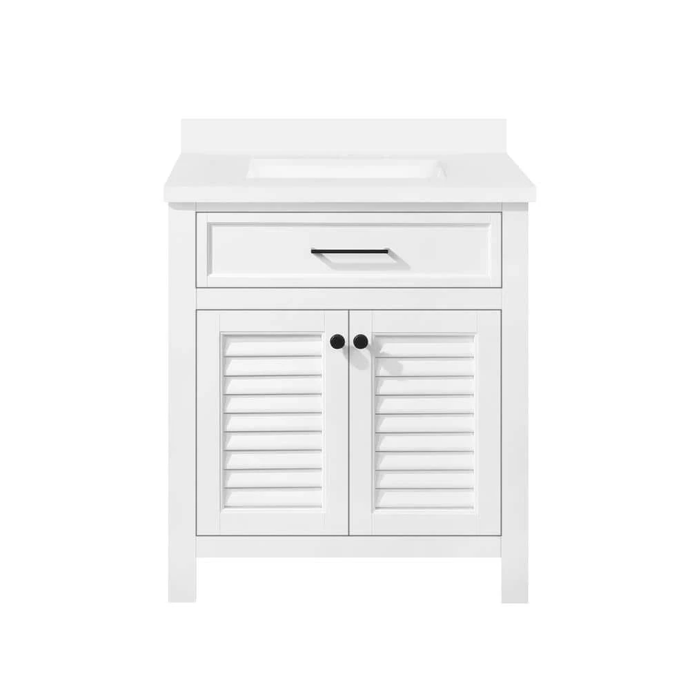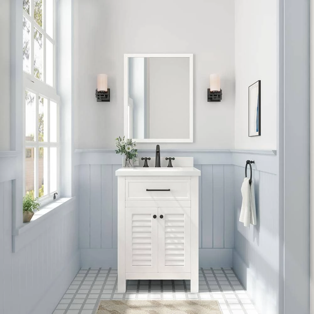 Improve the look of your bathroom with this Marksfield 24 in. W x 22 in. D Bath Vanity in White with Cultured Stone Vanity Top in White with White Basin. This adds an elegant touch to your space. It features black hardware details, a marble top and ceramic sink.